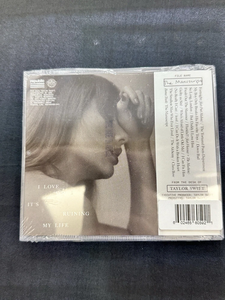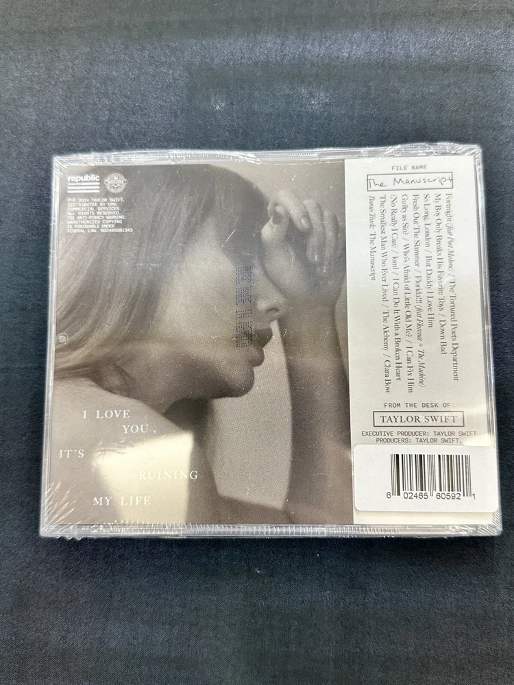 Format: CD Producer: Taylor Swift, Jack Antonoff, Aaron Dessner Color: Multicolor Release Title: The Tortured Poets Department Features: Sealed Artist: Taylor Swift gtin13: Does not Apply Language: English Edition: Limited Edition UPC: Does not Apply Style: Country Pop Case Condition: Excellent (EX) Run Time: 122:21 Genre: Country, Pop Occasion: Birthday, Carnival, Christmas, New Year, Wedding Type: Album Era: 2020s Country/Region of Manufacture: Unknown Record Label: Universal Music Group Release Year: 2024