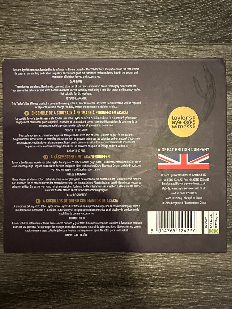 Number of Items in Set:4Brand:Taylor's Eye WitnessColor:BrownPattern:Animal PrintCountry/Region of Manufacture:ChinaCustom Bundle:NoPersonalize:NoUPC:Does not applygtin13:Does not applyType:Cheese KnifeTheme:Animals
