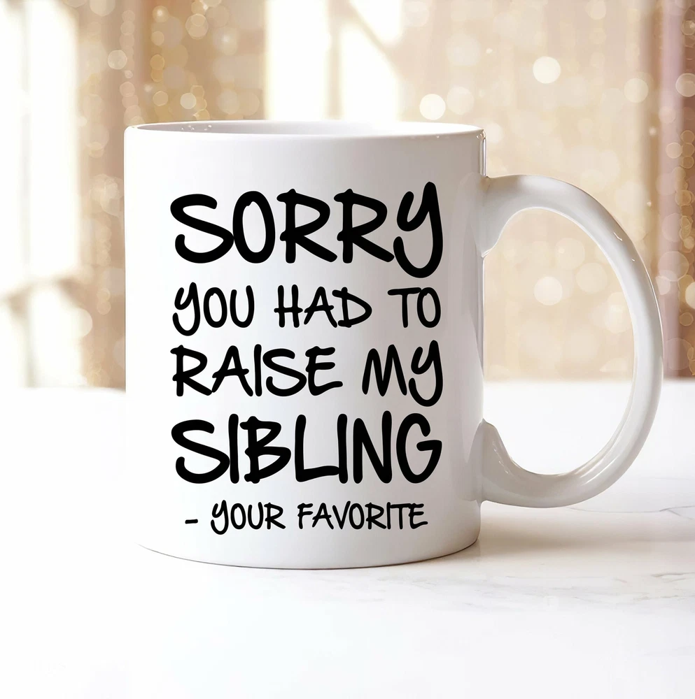 Personalized Sorry You Had To Raise My Sibling Coffee Mug Funny Mug For Mom For Product Details.. This high quality 11oz. ceramic white mug has a premium hard coat that provides crisp and vibrant color reproduction sure to last for years. Perfect for all hot & cold beverages. The highest quality printing possible is used. It will never fade no matter how many times you wash it. Material: 100% Ceramic. Print both sides. Dishwasher and Microwave Safe. High Gloss + Premium White Finish. Printed in the U.S.A. Personalized & Custom. We support personalized and custom mug to add custom, when placing an order, you can add notes to the "order note" in shipping address section. Also you can contact us directly via message. Shipping Info. Ready to ship in 1 to 2 business days, All products are made-to-order and proudly printed in the United States. Shipped by USPS and DHL, You will receive your order in 5-7 days. Replace & Refund. All products are defective during shipping broken, chipped will be replaced free of charge. You are not satisfied with the product, we will refund 100% money to you. If any other issues arise, please do not hesitate to message, we would be more than happy to assist you.