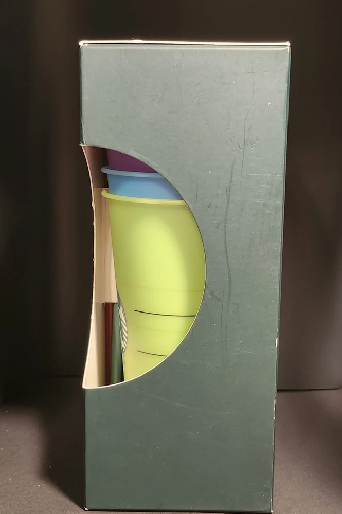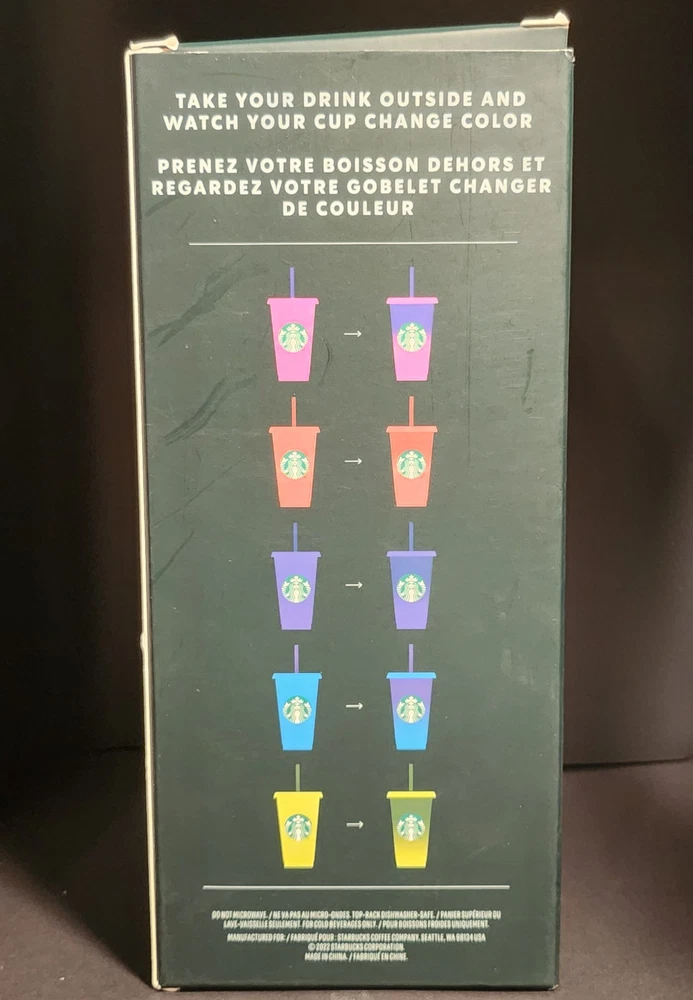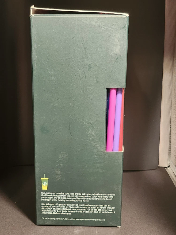 These reusable cold cups are UV activated. Take them outside and the sun will change their color! Take them to your local Starbucks when purchasing your favorite cold drink and help decrease plastic waste. Includes 5-24 ounce cups with matching lids and straws. BPA free. Never used and will come in original packaging.
