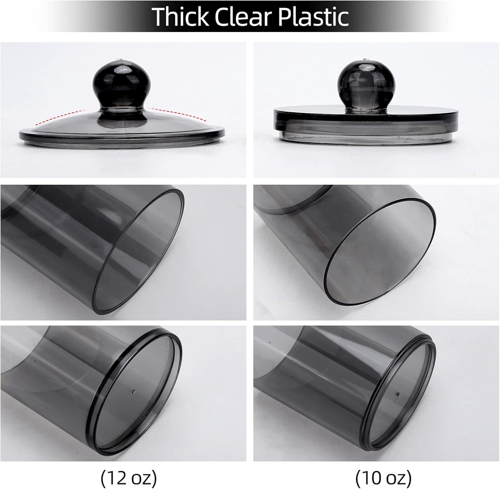 Packing: 2 pcs samll jars into 2pcs large jars, not just 2 jars, please check carefully when you receive the package Size - 10oz: With the lid, height = 4.4 inches, diameter = 2.7 inches Without lid: about 3.5 high, 12oz: With the lid, height = 4.8 inches, diameter = 3 inches Without lid: about 3.6 high Q tip Storage Organizer - Look like glass but are a really sturdy plastic and will not shatter, safe for kids Bathroom Accessories - Each floss pick dispenser has a removable lid and a wide mouth, easy to get them out These canisters are great looking and perfect for the vanity, bathroom and kitchen Product Description 4 Pack Bathroom Accessories Organizer - 12oz & 10oz Qtip Holder Dispenser for Cotton Ball Swab Pad Bathroom Storage Containers 4 individual Jar on the package Little things also allowed. Easy to get your fingers downet your fingers down Hard solid plastic,Looks just like glass - lightweight won't broken and hurt your kids Small size but can hold many things. Doesn't take too much space and it keeps things organized on your vanity 4 lids fit very tightly to keep form dust