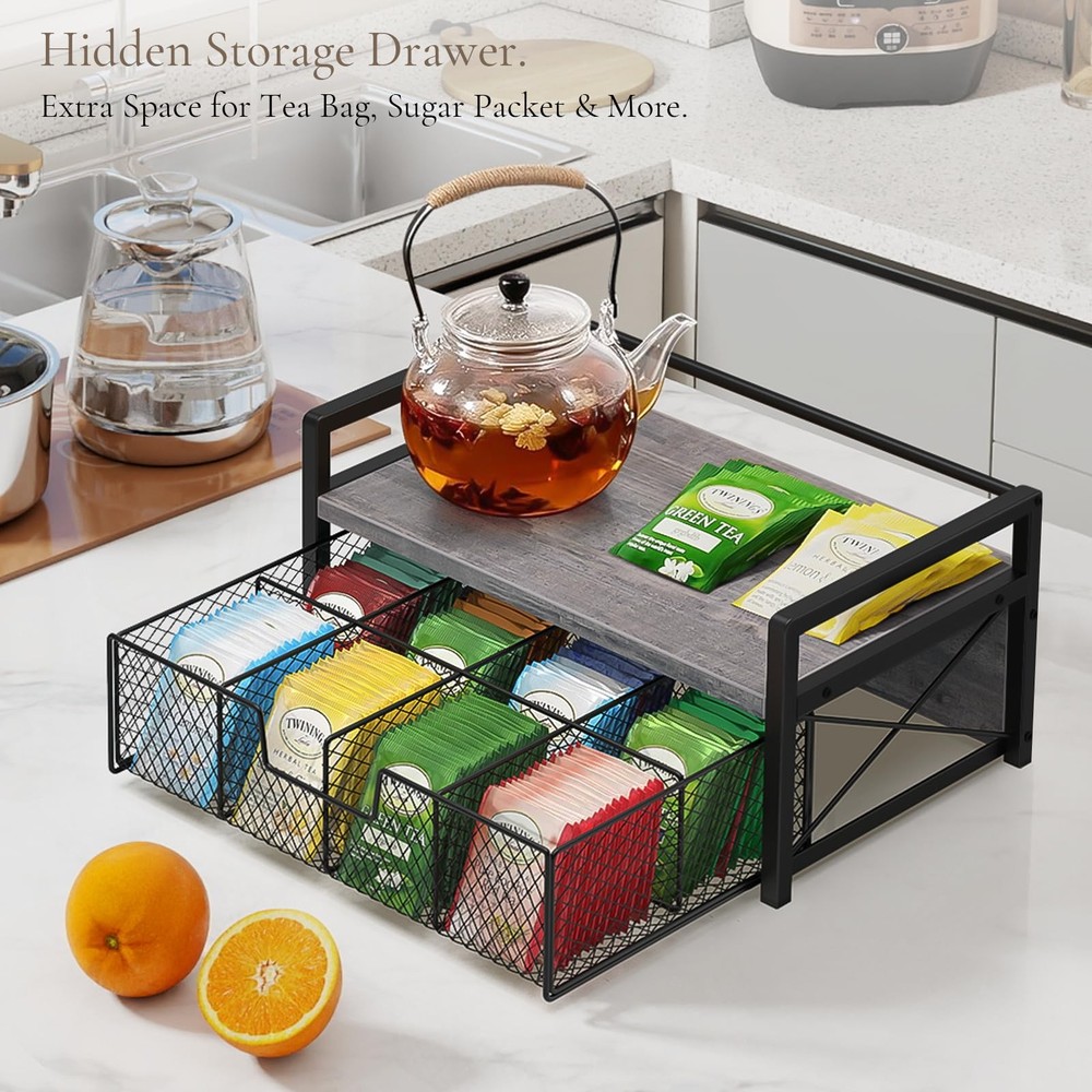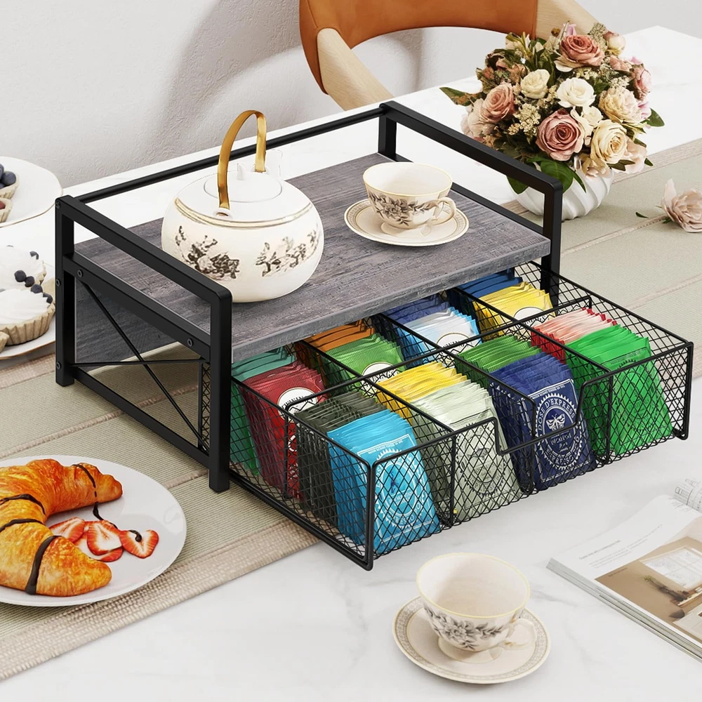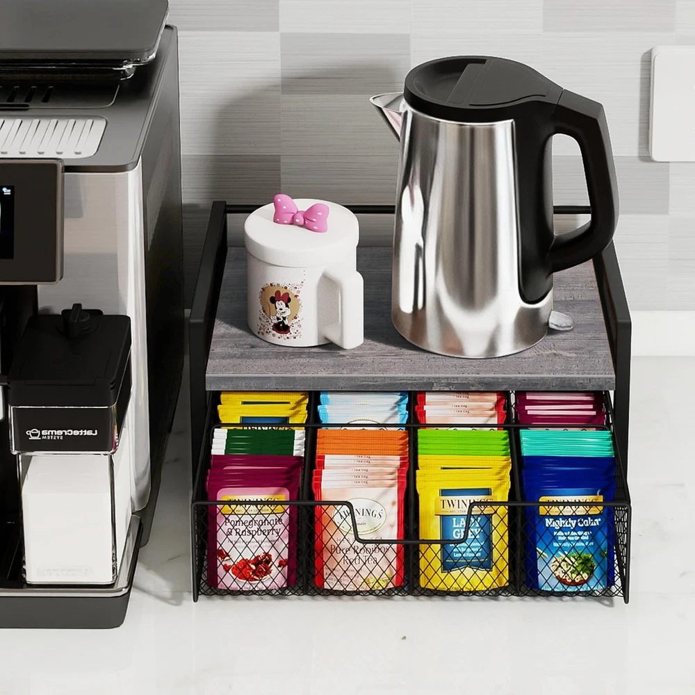 This Tea Bag Organizer in modern gray is equipped with a smartly designed 8-compartment pull-out drawer and a secure wooden top tray bordered by a protective rim, creating dedicated space to neatly contain all your teapot, teacup, coffee pods, k-cups, office supplies, or kitchen spices. Constructed from quality materials and supported by a robust “X” shaped metal frame with handles, it offers lasting durability alongside convenient portability. More than a simple organizer, it seamlessly converts any countertop into a tidy and fashionable tea station or coffee bar, standing as the ideal thoughtful gift for anyone who cherishes an orderly and welcoming home. Multi-Purpose Storage & Organization Hub: This tea bag organizer acts as a practical hub for your countertop essentials. It helps store and organize tea bags, coffee pods, k-cups, office supplies, or kitchen spices, contributing to a tidy and functional coffee station, desk, or kitchen area. Spacious Organized Storage: Featuring a cleverly designed pull-out drawer divided into 8 distinct sections, it provides dedicated and roomy storage for an array of tea varieties and accessories. The accompanying top storage area offers further space to neatly arrange all your tea essentials. Secure Top Tray & Sturdy Portable Design: This tea box organizer and storage box features a wooden top tray with a protective rim to help keep teaware, sugar jars, or decorative plants in place. Supported by a sturdy “X” shaped metal frame with integrated handles, the entire unit remains solid for daily use while being easy to move around your kitchen or home. Decorative Home Accent: Finished in versatile modern gray, this tea bag holder organizer adds a modern accent to any countertop. It serves as a decorative display piece, complementing the style of your tea station or kitchen with its contemporary color. An Ideal Gift for Organized Living: Expertly crafted and thoughtfully designed, this tea bag holder makes an excellent gift for tea aficionados, coffee lovers, or housewarmings. It's a practical and stylish present that shows consideration.