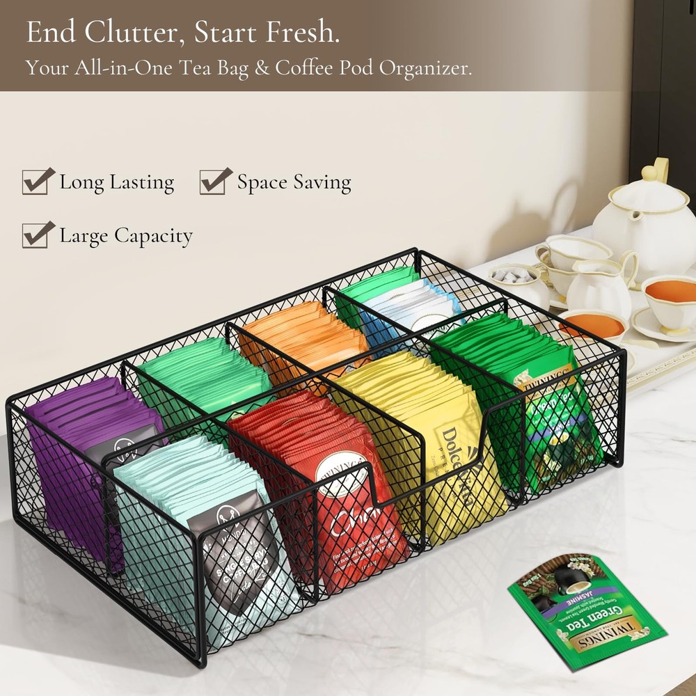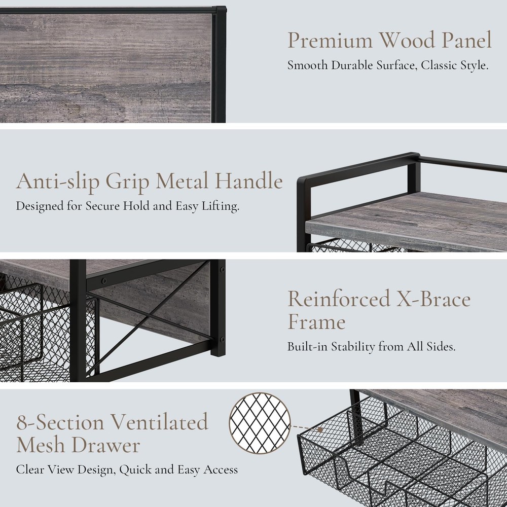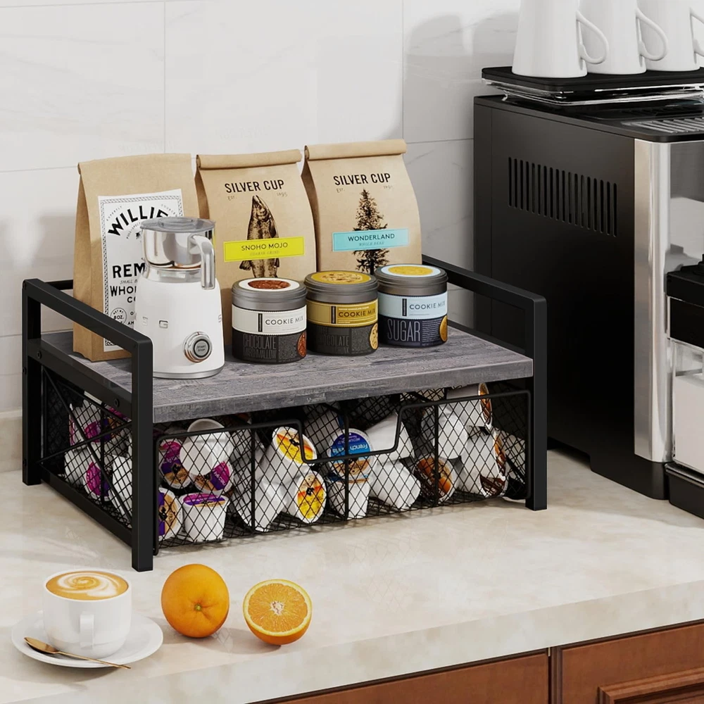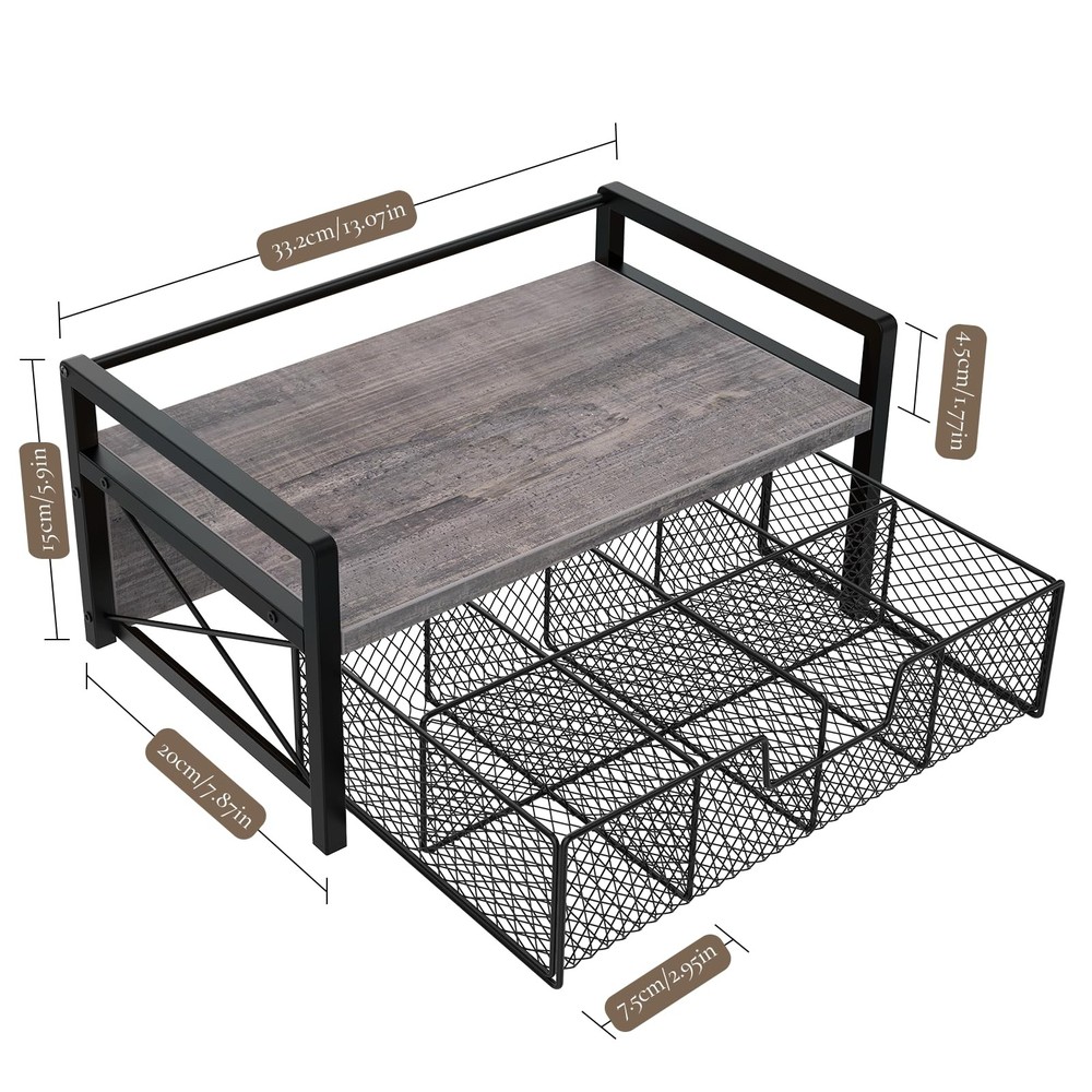 This Tea Bag Organizer in modern gray is equipped with a smartly designed 8-compartment pull-out drawer and a secure wooden top tray bordered by a protective rim, creating dedicated space to neatly contain all your teapot, teacup, coffee pods, k-cups, office supplies, or kitchen spices. Constructed from quality materials and supported by a robust “X” shaped metal frame with handles, it offers lasting durability alongside convenient portability. More than a simple organizer, it seamlessly converts any countertop into a tidy and fashionable tea station or coffee bar, standing as the ideal thoughtful gift for anyone who cherishes an orderly and welcoming home. Multi-Purpose Storage & Organization Hub: This tea bag organizer acts as a practical hub for your countertop essentials. It helps store and organize tea bags, coffee pods, k-cups, office supplies, or kitchen spices, contributing to a tidy and functional coffee station, desk, or kitchen area. Spacious Organized Storage: Featuring a cleverly designed pull-out drawer divided into 8 distinct sections, it provides dedicated and roomy storage for an array of tea varieties and accessories. The accompanying top storage area offers further space to neatly arrange all your tea essentials. Secure Top Tray & Sturdy Portable Design: This tea box organizer and storage box features a wooden top tray with a protective rim to help keep teaware, sugar jars, or decorative plants in place. Supported by a sturdy “X” shaped metal frame with integrated handles, the entire unit remains solid for daily use while being easy to move around your kitchen or home. Decorative Home Accent: Finished in versatile modern gray, this tea bag holder organizer adds a modern accent to any countertop. It serves as a decorative display piece, complementing the style of your tea station or kitchen with its contemporary color. An Ideal Gift for Organized Living: Expertly crafted and thoughtfully designed, this tea bag holder makes an excellent gift for tea aficionados, coffee lovers, or housewarmings. It's a practical and stylish present that shows consideration.
