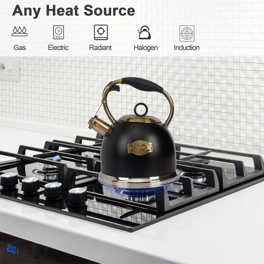 Product Features Color Black Material Stainless Steel Item Weight 1.02 Kilograms Style Modern About this Item · Stainless Steel Design : Whole teakettle body are made of stainless steel, The thick body making it more durable and sturdy. 5-layer metal bottom with high thermal conductivity for more uniform heating and longer service life. · Perfect Whistling Sound of Teakettle: This tea kettle for stovetop has a tight-fitting lid keeps steam in the hot tea kettle for rapid heating, and realse pleasant whistles sound when water reaches a boil, Loud enough to alarm you when you busy in the next room. · One-hand Trigger Teapots : This tea pot for stovetop with One-hand trigger mechanism that allows for a convenient-one handed operation.ergonomic coated and contoured handle offer a easy gripping and Pouring. · Sutable for Various Stovetops: Teapot suitable for any heat source including induction cooker, electric stove, gas stove, radiant stove.Please use midium heat source and prolong the service life,otherwise it would burn dry the tea kettle and discolor the body surface. · Warning Tips :Please using small or midium heating flame to boiling water to prevent teapots body discolor or color fading. It's normal phenomenon and can be remove if stainless steel produce "rust" or limescale inside of the kettle. If you meet any problems, please contact us and we will help you fix your issue ASAP. Description Tea Kettle -3.0 Quart Tea Kettles Stovetop Whistling Teapot Stainless Steel Tea Pots for Stove Top Whistle Tea Pot Product Details Color Black Material Stainless Steel Item Weight 1.02 Kilograms Style Modern Product Dimensions 8.26"D x 8.26"W x 9.64"H Capacity 3 Quarts Lid Material Stainless Steel Whistling Yes Handle Material Stainless Steel Is Dishwasher Safe No Size 3 Quarts Item Weight 2.25 pounds Date First Available June 7, 2022
