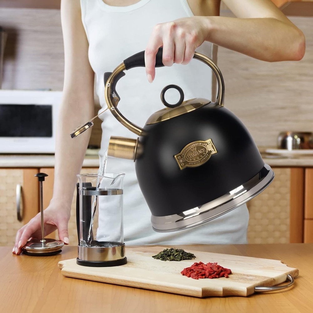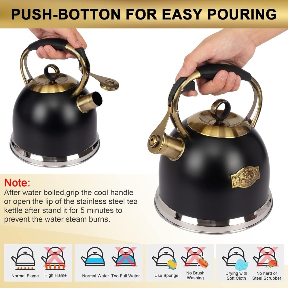 Stainless Steel Whistling Tea Kettle β One-Handed Operation & Rapid Heating Enjoy your perfect cup of tea with this Stainless Steel Whistling Tea Kettle . Designed for durability, efficiency, and ease of use, it makes boiling water a breeze with its pleasant whistling sound and user-friendly features. π Premium Stainless Steel Design Durable and sturdy construction with a 5-layer metal bottom High thermal conductivity for uniform heating Long-lasting service life, resistant to wear and tear Attractive, sleek stainless steel body for a modern kitchen look πΆ Perfect Whistling Sound Tight-fitting lid traps steam for faster boiling Pleasant whistling sound alerts you when water is ready, even from another room Loud enough to catch your attention when you're busy π One-Hand Trigger Mechanism Convenient one-handed operation for easy pouring Ergonomic coated handle for a comfortable grip Contoured design ensures easy pouring without spills π₯ Suitable for All Heat Sources Works on all stovetops : induction, electric, gas, and radiant stoves Recommended for medium heat to prolong the kettle's life Avoid overheating to prevent discoloration and burning β οΈ Warning Tips Use small or medium heat to prevent body discoloration Rust or limescale may appear over time but can be cleaned For any issues, please contact customer service for support