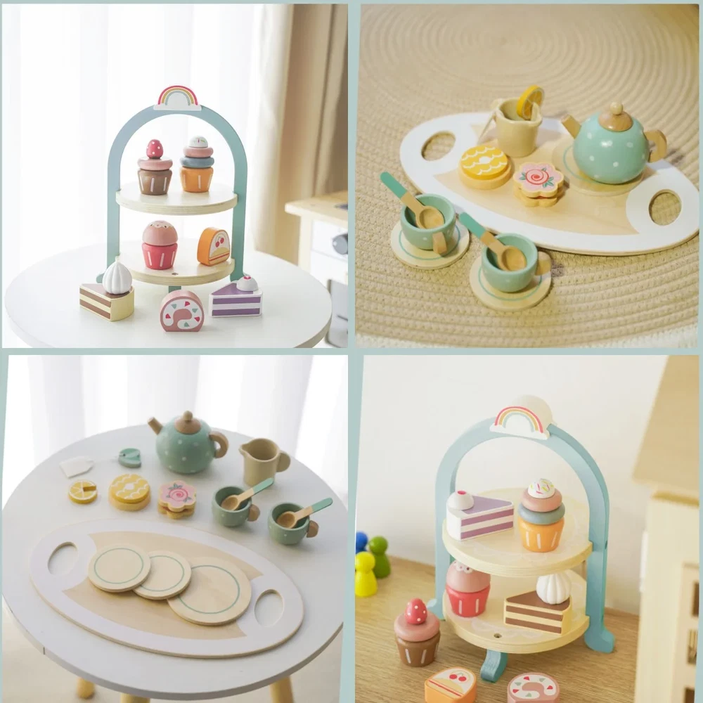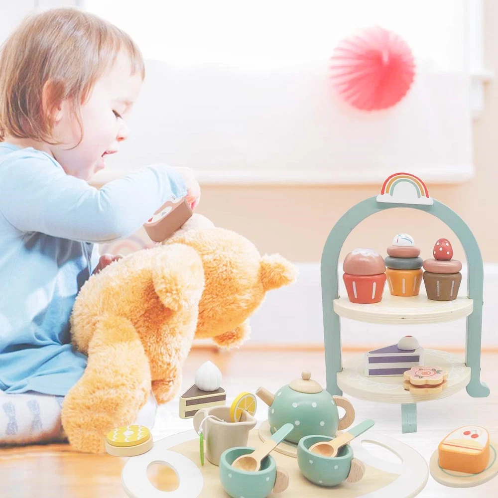 Wooden Kitchen Accessories for Imaginative Play : Enhance your child's pretend play experience with our charming wooden play tea set. Perfect for tea parties and creative playtime, little girls and boys will delight in serving tea to their friends and family. Complete Tea Party Set: Our set includes 1 tea tray , 1 teapot, 2 cups, 3 coasters, 1 milk jug, 2 stirring spoons, 1 lemon slice, 1 tea bag, 1 small cake, 1 cookie, and 1 cake stand. The tea tray measures 11.4 inches long and 6.9 inches high, while each accessory is designed to be safe and easy for children aged 3-8 to handle, promoting fine motor skills. Attractive and Unique Design : The tea set features a variety of vibrant colors that capture children's attention. The gentle and captivating Morandi colors help improve concentration and immerse kids in imaginative play. Encourage your child to engage in pretend play with friends or engage in parent-child activities, fostering cognitive skills, language development, and overall happiness. Safe and Durable Materials : Crafted from high-quality natural wood, our interactive toy tea set is built to last. All edges are polished for smoothness, ensuring a safe play experience. Whether at home, in kindergartens, or classrooms, this versatile tea set can be enjoyed anywhere, promoting social skills and cooperative play. Great Gift Idea: Our tea set is a wonderful gift for children aged 3-8, providing them with an opportunity to simulate adult tea parties. Let your child enjoy precious moments with family members or friends during afternoon tea. It also offers a chance for parents to take a break or bond with their children during playtime. Through pretend play, children enhance their communication, imagination, creativity, and empathy, while experiencing the joy of role-playing and caregiving. All the accessories are in the box. Complete Tea Party Set: Our set includes 1 tea tray, 1 teapot, 2 cups, 3 coasters, 1 milk jug, 2 stirring spoons, 1 lemon slice, 1 tea bag, 1 small cake, 1 cookie, and 1 cake stand. The tea tray measures 11.4 inches long and 6.9 inches high, while each accessory is designed to be safe and easy for children aged 3-8 to handle, promoting fine motor skills Attractive and Unique Design: The tea set features a variety of vibrant colors that capture children's attention. The gentle and captivating Morandi colors help improve concentration and immerse kids in imaginative play. Encourage your child to engage in pretend play with friends or engage in parent-child activities, fostering cognitive skills, language development, and overall happiness Safe and Durable Materials: Crafted from high-quality natural wood, our interactive toy tea set is built to last. All edges are polished for smoothness, ensuring a safe play experience. Whether at home, in kindergartens, or in classrooms, this versatile tea set can be enjoyed anywhere, promoting social skills and cooperative play Great Gift Idea: Our tea set is a wonderful gift providing them with an opportunity to simulate adult tea parties. Let your child enjoy precious moments with family members or friends during afternoon tea. It also offers a chance for parents to take a break or bond with their children during playtime. Through pretend play, children enhance their communication, imagination, creativity, and empathy, while experiencing the joy of role-playing and caregiving All the accessories are in the box