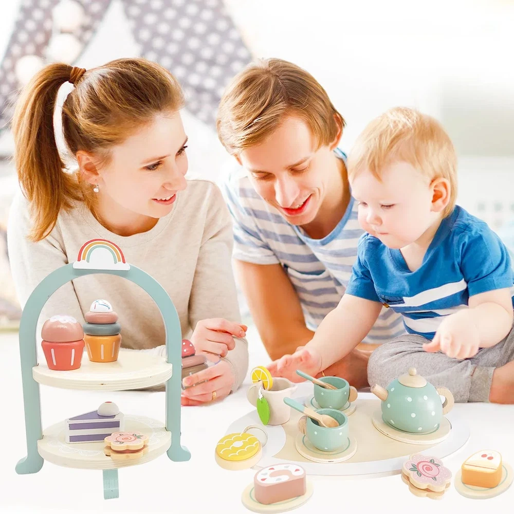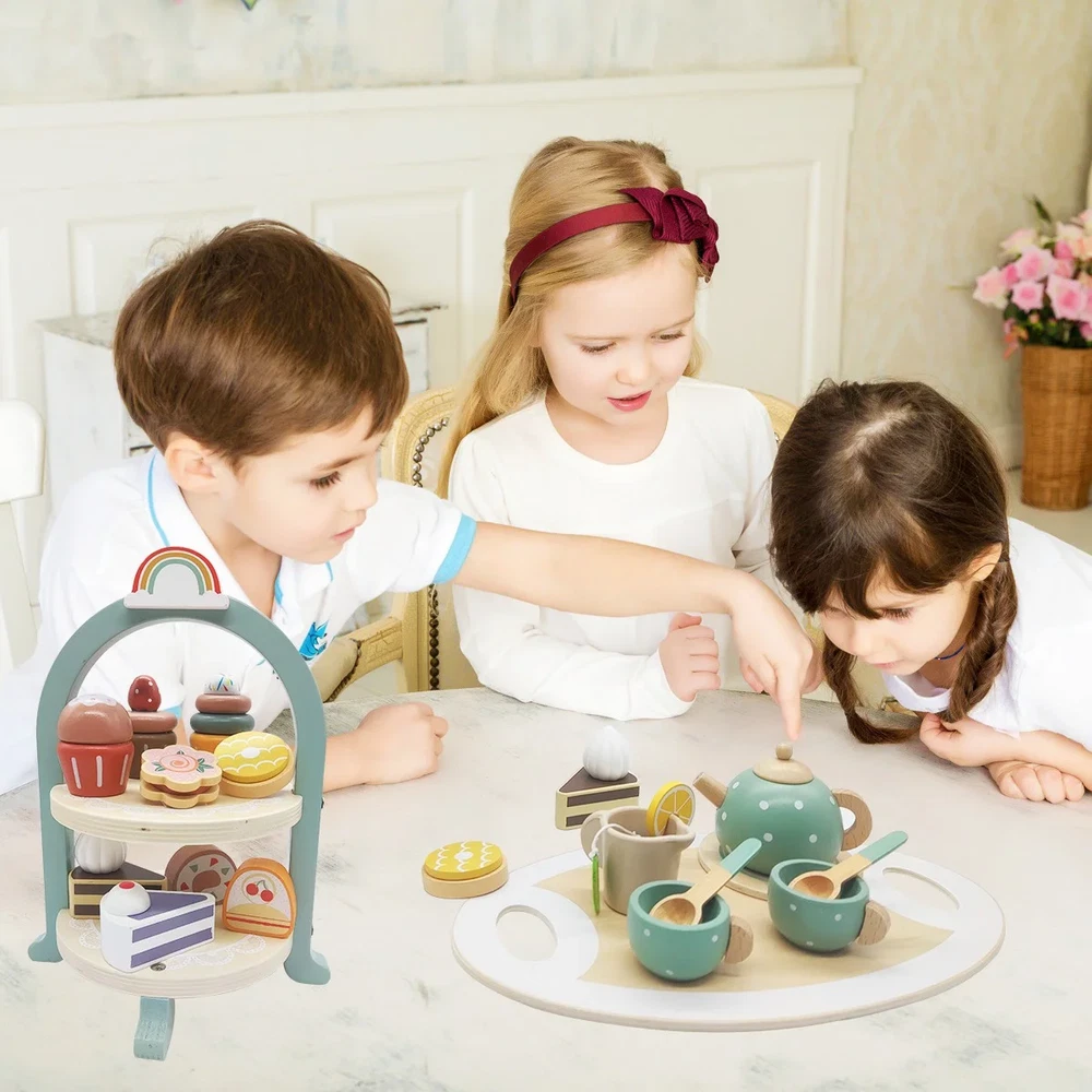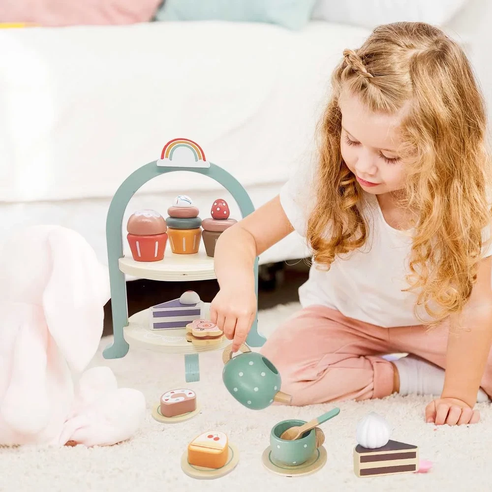 Tea Party Set for Little Girls, Wooden Tea Set with Cake Stand, Food Pretend ...