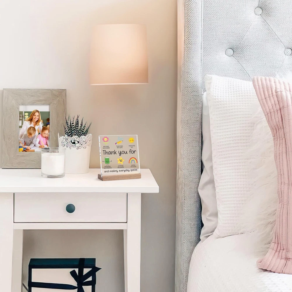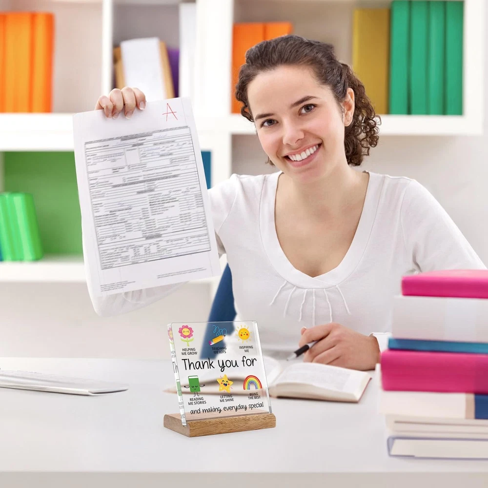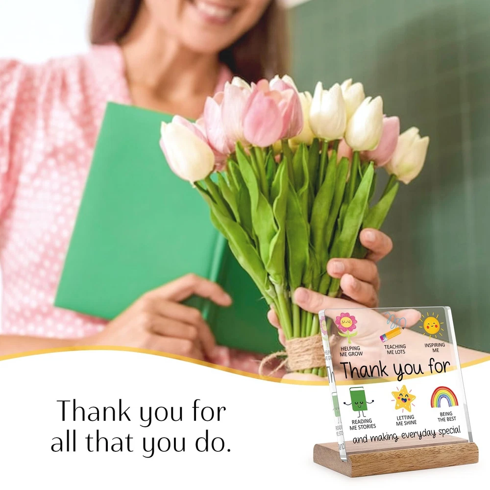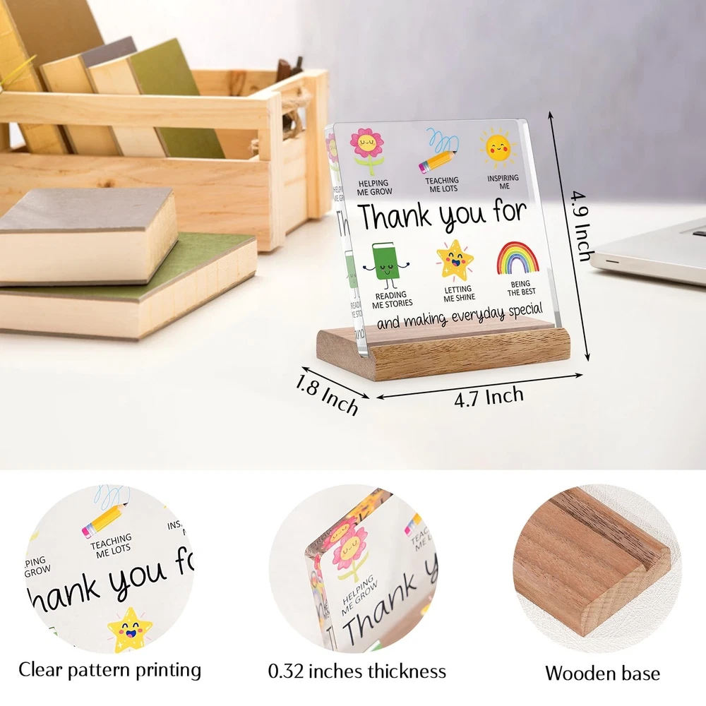 Teacher Appreciation Gifts for Women Men Teacher Desk Decor - Teacher Thank You for Helping Me Grow Gifts for Daycare Teacher Preschool Teacher New Teacher Goodbye Gift Ideas Acrylic Plaque Product Details Color: Color Brand: Cituarko Material: Wood, Acrylic Theme: Art Mounting Type: Tabletop Brand Name: Cituarko Mounting Type: Tabletop Shape: Square Style Name: Art Deco Theme: Art Color: Color Item Dimensions L x W: 4.7"L x 4.7"W Material Type: Wood, Acrylic Heartfelt Appreciation: Show your gratitude with this beautiful acrylic plaque, a perfect teacher appreciation gift. It features a thoughtful message and charming illustrations that capture the essence of teaching Quality Materials: Made from durable acrylic material, measuring 4.7 x 4.7 inches, and comes with a sturdy wooden base for easy display. This teacher gift would be a sentimental teacher appreciation day gift ideas Inspirational Design: Features cute icons representing teaching, growth, inspiration, and reading stories. The message "Thank you for helping me grow" is prominently displayed, making it a meaningful teacher appreciation gift Versatile Gift Idea: Perfect for end-of-year gifts, birthdays, or any occasion to express your appreciation for their hard work and dedication. Ideal as a daycare goodbye gift, preschool teacher gift, new teacher gift, and for the best teachers Uniquely Daily Reminders: A special touch that will remind teachers how much they mean to their students. This teacher gift will brighten up their workspace and serve as a lasting reminder of your gratitude Thank you gifts for women