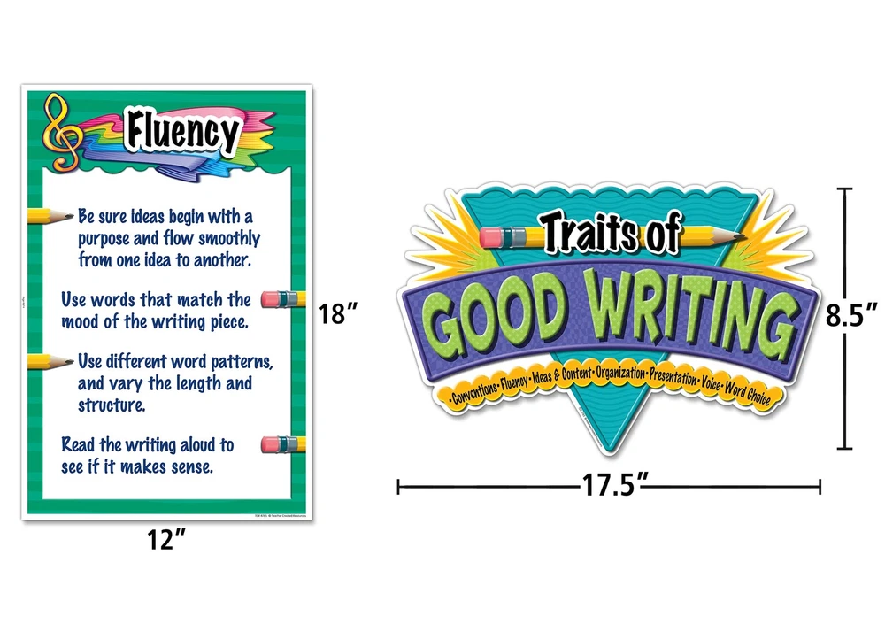 Seven posters describe the seven traits of good writing. The visual reminders help young writers master each trait. Each poster measures 12" x 18". The 4-page teacher's guide provides related tips and activities. Shiny, protective coating adds durability. This product is acid-free per industry standards; contact us for technical information. Seven posters describe the seven traits of good writing The visual reminders help young writers master each trait Each poster measures 12" x 18"