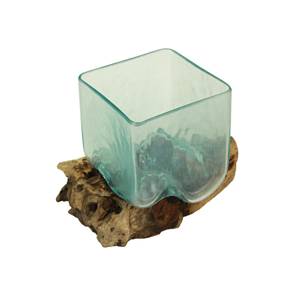 Versatile Size - This piece measures approximately 9 inches long, 8 inches high, and 7.5 inches wide, with slight variations due to its handcrafted nature, ensuring uniqueness in every item. Quality Craftsmanship - Crafted with care, this sculpture features a molten glass vase delicately formed over a teak driftwood base, creating an elegant and earthy decorative accent suitable for various purposes. Individual Beauty - The clear glass bowl is meticulously shaped over an organic wood base, resulting in a distinctive glassscape bottom, making it an exquisite addition to tables, counters, or desks, showcasing nature's artistry indoors. Our eBay Store About Us Add to Favorite Sellers Teak Driftwood and Melted Glass Square Vase, Bowl, or Planter – Approximately 8 Inches High – Nature-Inspired Elegance for Home and Patio Decoration Versatile Size - This piece measures approximately 9 inches long, 8 inches high, and 7.5 inches wide, with slight variations due to its handcrafted nature, ensuring uniqueness in every item. Quality Craftsmanship - Crafted with care, this sculpture features a molten glass vase delicately formed over a teak driftwood base, creating an elegant and earthy decorative accent suitable for various purposes. Individual Beauty - The clear glass bowl is meticulously shaped over an organic wood base, resulting in a distinctive glassscape bottom, making it an exquisite addition to tables, counters, or desks, showcasing nature's artistry indoors. Natural Charm - Ideal for succulent gardens, air plants, greenery, herb cultivation, or crafting personalized terrariums and fairy gardens, this piece adds a touch of the natural world to any space, bringing a sense of tranquility and beauty. Perfect Gift - Whether for your home or as a thoughtful present for loved ones, this unique and versatile glass and teak sculpture makes an excellent gift choice, showcasing the beauty of nature through artistic craftsmanship. Experience the perfect fusion of nature and artistry with this captivating sculptural vase. The square bowl, crafted from molten glass, features organic shapes that beautifully capture nature's essence. Its elegant design is complemented by the natural contours of teak driftwood, creating a striking contrast. Measuring approximately 9 inches long, 8 inches high, and 7.5 inches wide (sizes may vary slightly), this versatile piece offers endless possibilities for creative expression. Use it to showcase house plants, cultivate fresh herbs, or design a whimsical fairy garden. Alternatively, fill it with vibrant stones, shells, or dried flowers to create a stunning centerpiece. The transparent glass, with its molten elegance, enhances any space with its organic charm. Whether used as a decorative focal point, a terrarium, or a vessel for floral arrangements, this piece adds a touch of natural allure to your home. Each element is expertly crafted by artisans, embodying the beauty of nature and enriching your décor with unique sophistication. Product Details Color Brown Height 8 Length 9 Weight 6.3 LB