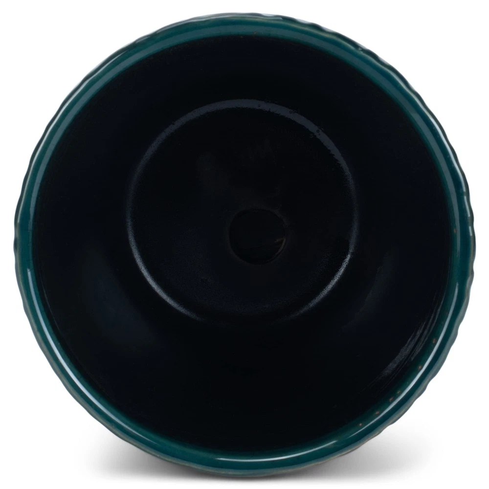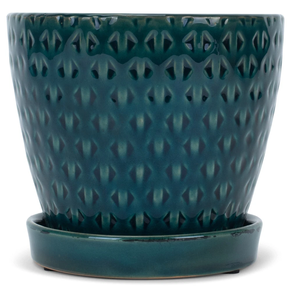 Embossed ceramic planter with a reactive teal glaze for long-lasting beauty. Measures 4.25-inches high and 5-inches in diameter and includes a matching saucer. Look to for a -stop-shopping home for all your floral, garden, gift and seasonal decor needs. For over 75 years has provided a wide range of seasonal designs, garden living, inspirational assortments and collections to help add functional decor to your outdoor spaces. INDOOR/OUTDOOR PLANTERS: Durable, high quality ceramic and glaze finish for long lasting beauty and use; suitable for any room in any home SMALL SIZE: Measures 4.25-inches high and 5-inches in diameter; matching saucer ALL-OVER INDENTED ARROW DESIGN ON EXTERIOR: Reactive teal glaze adds drama and dimension; nature of the process ensures no 2 look exactly alike IDEAL GIFT FOR GREEN THUMBS: Neutral design fits most décor and will accent any room in the home; add a favorite plant for a gift they'll never forget HOME AND GARDEN DÉCOR: Proud to be the leading source for all your home and garden décor for over 75 years - from floral containers, garden accessories whimsical to memorial, seasonal and holiday accents