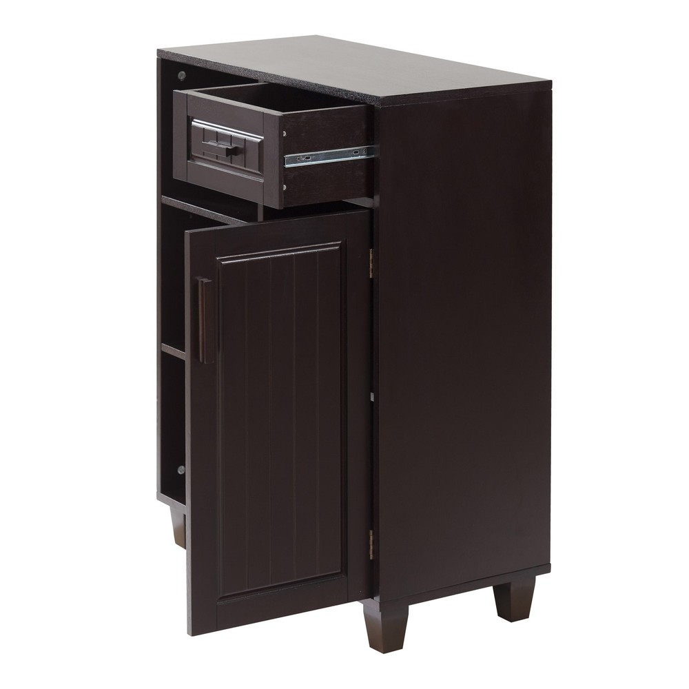 Upgrade your home storage while adding classic decor with the Teamson Home Catalina Wooden Floor Cabinet with Storage Drawer. This decorative cabinet features a sleek espresso finish and a crown molded door for a beautiful addition to your space. The included top drawer, 3 open shelves, and inner adjustable shelf help to reduce clutter and keep your home tidy. Constructed from durable engineered wood, this floor cabinet is built to provide you with long-lasting organization. Easy, step-by-step instructions and all of the hardware needed for installation are included for quick assembly. Purchase this stylish cabinet alone or with other items from the Catalina collection for a cohesive, updated look. The Teamson Home Catalina Wooden Floor Cabinet with Storage Drawer measures 15.5" x 26" x 34 Teamson Home Catalina Mixed Storage Freestanding Floor Cabinet Features Dark espresso finish with beadboard-paneled doors and wooden pull handles Two exterior adjustable shelves on one side of the cabinet and one interior adjustable shelf inside Constructed from durable engineered wood, less likely to warp, crack, or rot to provide long-lasting use Easy step-by-step instructions and all of the hardware needed for installation included Dimensions: 15.51" L x 25.98" W x 34.29" H SKU:7718 The Teamson Home Catalina Wooden Mixed Storage Freestanding Floor Cabinet features a sleek espresso finish with a beadboard paneled door and crown molding for a timeless addition to your space. Two open exterior adjustable shelves flank the left side of the cabinet while storage is hidden away on the right in a top drawer and small cabinet with an adjustable shelf inside. Constructed from durable engineered wood, this modern-styled floor cabinet provides you with long-lasting organization.