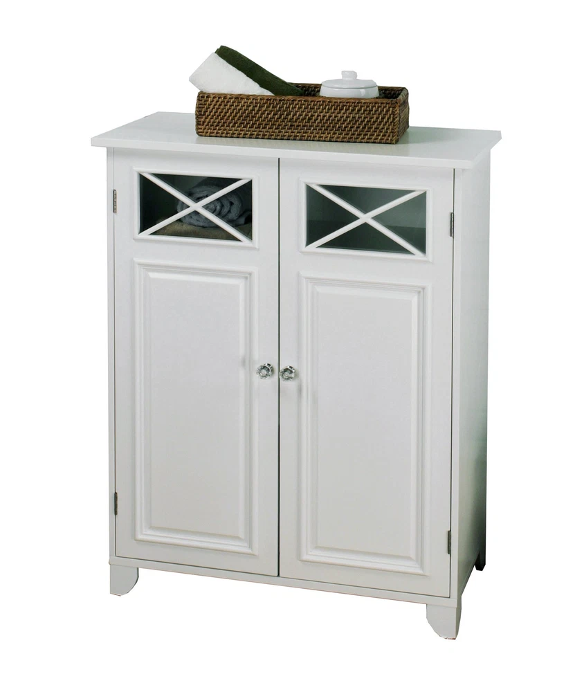 Upgrade your home storage while adding classic decor with the Teamson Home Dawson Wooden Floor Cabinet with Cross Molding and 2 Doors. This decorative cabinet features a white finish with cross molding on the glass-paneled doors and clear knobs for a beautiful addition to your space. The included fixed shelf and adjustable shelf help to reduce clutter and keep your home tidy. Constructed from durable engineered wood, this floor cabinet is built to provide you with long-lasting organization. Easy, step-by-step instructions and all of the hardware needed for installation are included for quick assembly. Purchase this stylish cabinet alone or with other items from the Dawson collection for a cohesive, updated look Teamson Home Dawson Two-Door Freestanding Floor Cabinet Features Features a classic white finish with cross molding on the glass-paneled doors and clear knobs for a beautiful addition to your space Features fixed shelf and adjustable shelf inside with magnetic latches to keep it closed Constructed from durable engineered wood, less likely to warp, crack, or rot to provide long-lasting use Easy step-by-step instructions and all of the hardware needed for installation included Dimensions: 25.98" L x 12.99" W x 32.24" H SKU:6841 Teamson Home Dawson Wooden Two-Door Freestanding Floor Cabinet features a white finish with decorative cross molding on two glass-paneled doors. Made of durable, engineered wood, it has a fixed and adjustable interior shelf for organization. Add extra storage for bathroom and kitchen supplies, or as a decorative piece to keep items organized and your home clutter-free.