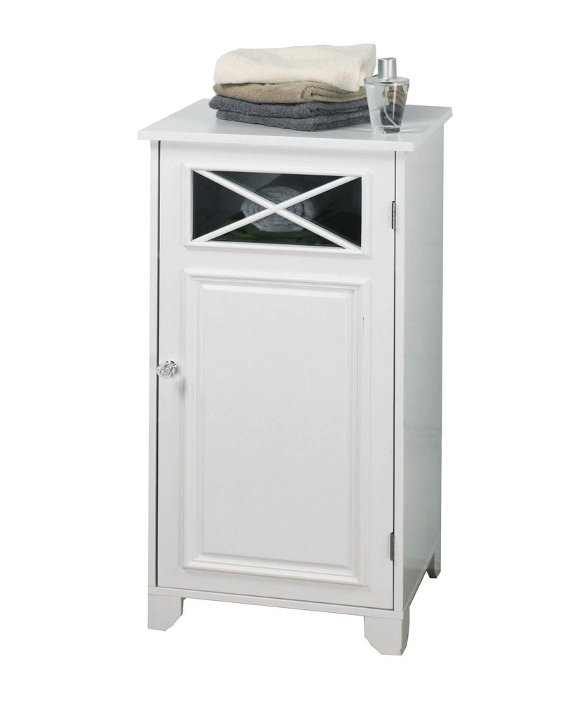 Upgrade your home storage while adding classic decor with the Teamson Home Dawson Wooden Floor Cabinet with Cross Molding. This decorative cabinet features a white finish with cross molding on the glass-paneled door and a clear knob for a beautiful addition to your space. The included fixed shelf and adjustable shelf help to reduce clutter and keep your home tidy. Constructed from durable engineered wood, this floor cabinet is built to provide you with long-lasting organization. Easy, step-by-step instructions and all of the hardware needed for installation are included for quick assembly. Purchase this stylish cabinet alone or with other items from the Dawson collection for a cohesive, updated look Teamson Home Dawson Freestanding Slim Floor Cabinet, White Features Features a classic white finish with cross molding on the glass-paneled door and clear knobs for a beautiful addition to your space Features three interior shelves for organization inside with magnetic latches to keep it closed Constructed from durable engineered wood, less likely to warp, crack, or rot to provide long-lasting use Easy step-by-step instructions and all of the hardware needed for installation included Dimensions: 12.99" L x 15.0" W x 32.01" H SKU:6834 Teamson Home's Dawson Freestanding Slim Floor Cabinet features a white finish with decorative cross molding on a glass-paneled doors. Made of durable, engineered wood, it has three fixed interior shelves for storage and organization anywhere. Add extra storage for bathroom and kitchen supplies, or as a decorative piece to keep items organized and your home clutter-free.