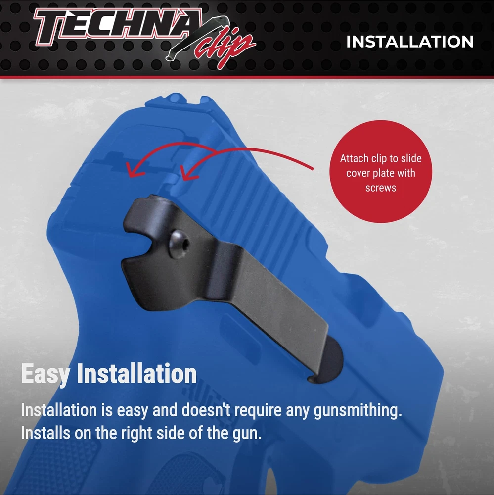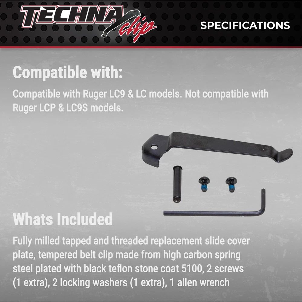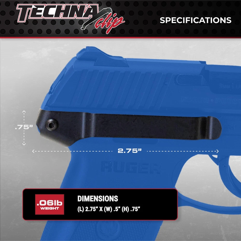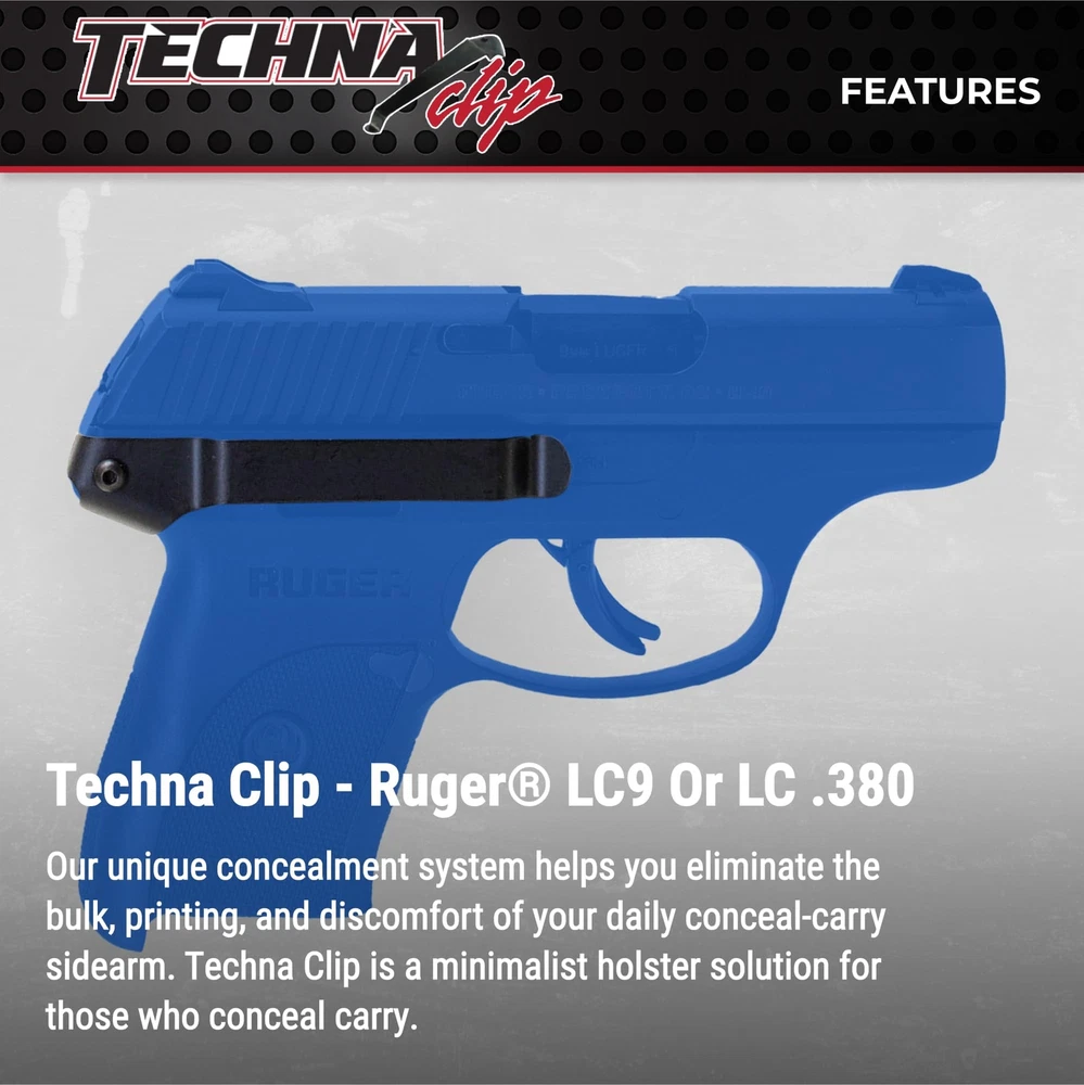 Are you tired of holsters that are bulky and bulgy? Are you ready for an amazingly comfortable and fast method for concealing your sidearm? Then, check out the Techna Clip for the Ruger LCP.380, a truly minimalist solution for those who conceal carry. It's a gun clip that easily affixes to your sidearm to deliver a secure, lightweight and discreet carry option without a holster. Your Techna Clip installs quickly and requires NO gunsmithing to your sidearm. Now you can stash your pistol in your pocket, on your waist, or even in the small of your back. Included in the Techna Clip kit is a fully-machined tapped and threaded steel replacement pin for attaching the Techna Clip to the Ruger LCP.380, a spring tempered Belt Clip made from High Carbon Spring Steel, plated with Black Teflon Stone Coat 5100, 2 screws (1 extra), 2 locking washers (1 extra), 1 Allen wrench. The high quality Teflon Stone Coat 5100 coating prevents abrasion to the sidearm by providing a thin but highly durable cushion between the Techna Clip and the slide. The Techna Clip comes in (black) and fits the Ruger LCP.380 models. This model will not fit the Ruger LC9/S or LC models; please see our other listings. Instructions: To install, simply remove the Ruger factory rear frame pin from the frame of the sidearm with a punch and mallet. Then, replace the rear frame pin with the replacement pin that was provided in the Techna Clip kit. Mount the Techna Clip on the right side of the slide with the provided screws and Allen wrench. Note: To keep the clip securely in place, the screw hole is slightly offset from the rear frame pin. Why buy a Techna Clip? Our Concealment System helps you eliminate the bulk and printing of your daily conceal-carry gun. Say goodbye to your bulky holsters that add unnecessary weight and discomfort. Conceal and carry on the go with our easy “Clip It & Go” system!" Instructions: To install, simply remove the Ruger factory rear frame pin from the frame of the sidearm with a punch and mallet. Then, replace the rear frame pin with the replacement pin that was provided in the Techna Clip kit. Mount the Techna Clip on the right side of the slide with the provided screws and Allen wrench. Note: To keep the clip securely in place, the screw hole is slightly offset from the rear frame pin. Why buy a Techna Clip? Our Concealment System helps you eliminate the bulk and printing of your daily conceal-carry gun. Say goodbye to your bulky holsters that add unnecessary weight and discomfort. Conceal and carry on the go with our easy “Clip It & Go” system! LOW PROFILE CONCEALMENT: Minimize bulk and printing with our gun clip holster concealment system, designed for seamless, low-profile concealed carry. BUILT FOR DURABILITY: Our high-carbon spring steel Glock clip holster is plated with Teflon Stone Coat 5100 for enhanced durability and corrosion resistance. It also includes grip plate replacement screws. EASY INSTALL: First, remove the rear frame pin from the gun's frame. Then, replace it with the provided threaded pin from Techna Clip. Finally, mount the gun holster clip on the right side of the slide using the included screws and Allen key. PERFECT MODEL MATCH: This holster belt clip is only compatible with compatible with Ruger LCP .380 ACP Pistols (it is not compatible with Ruger LC9/S or LC models). THE TECHNA CLIP WAY: We focus on minimalist firearm carry solutions that ensure a secure and discreet way to carry handguns, eliminating the bulk and hassle of other holsters. We provide a comfortable, zero-bulk alternative that’s user-friendly.