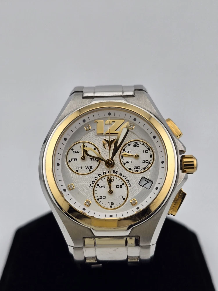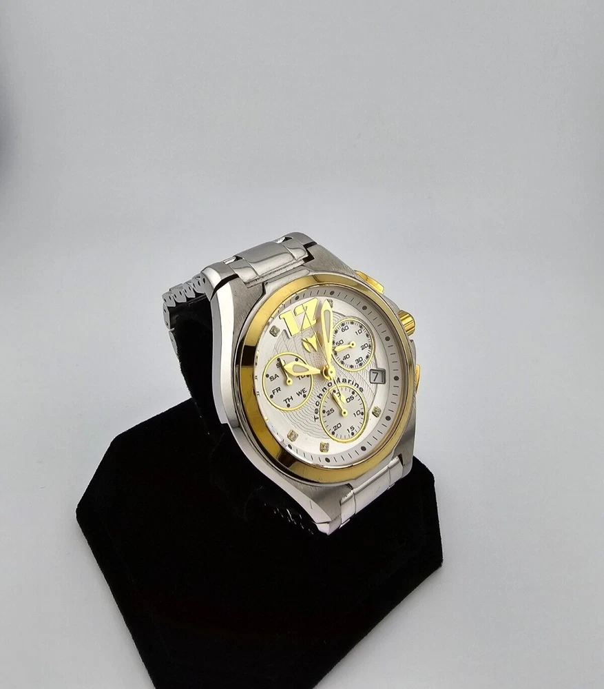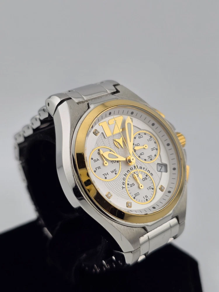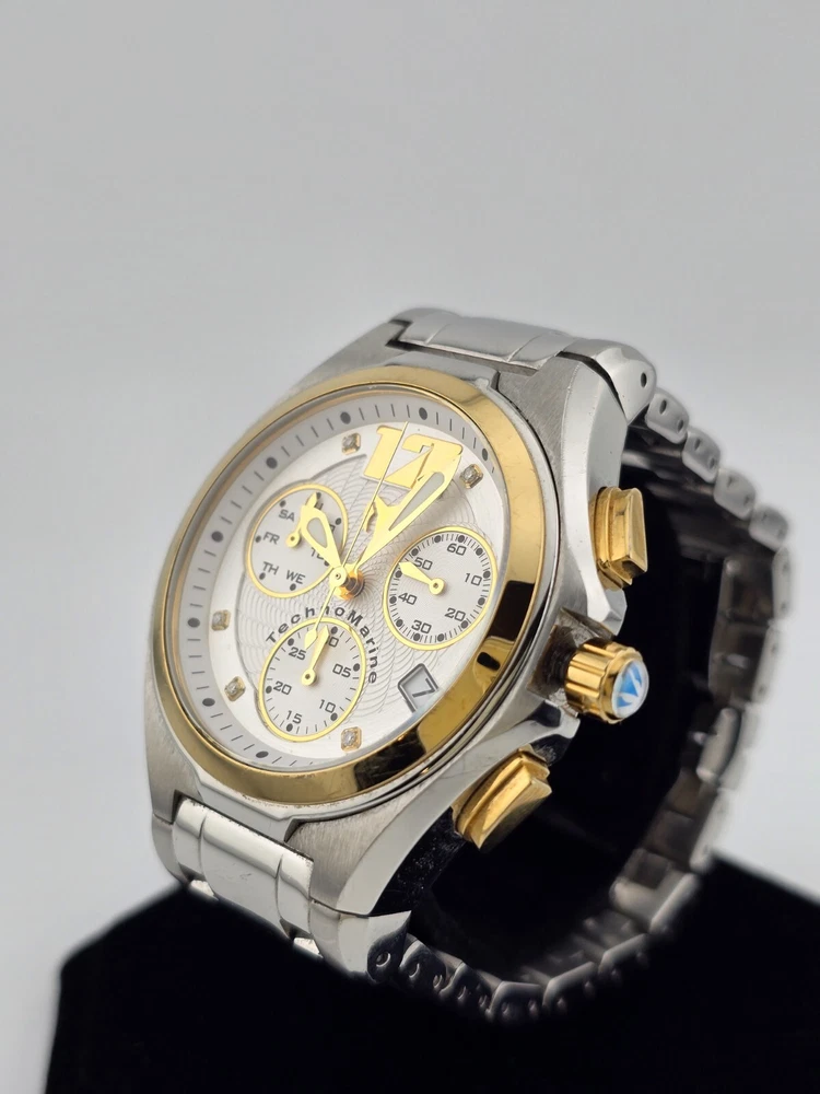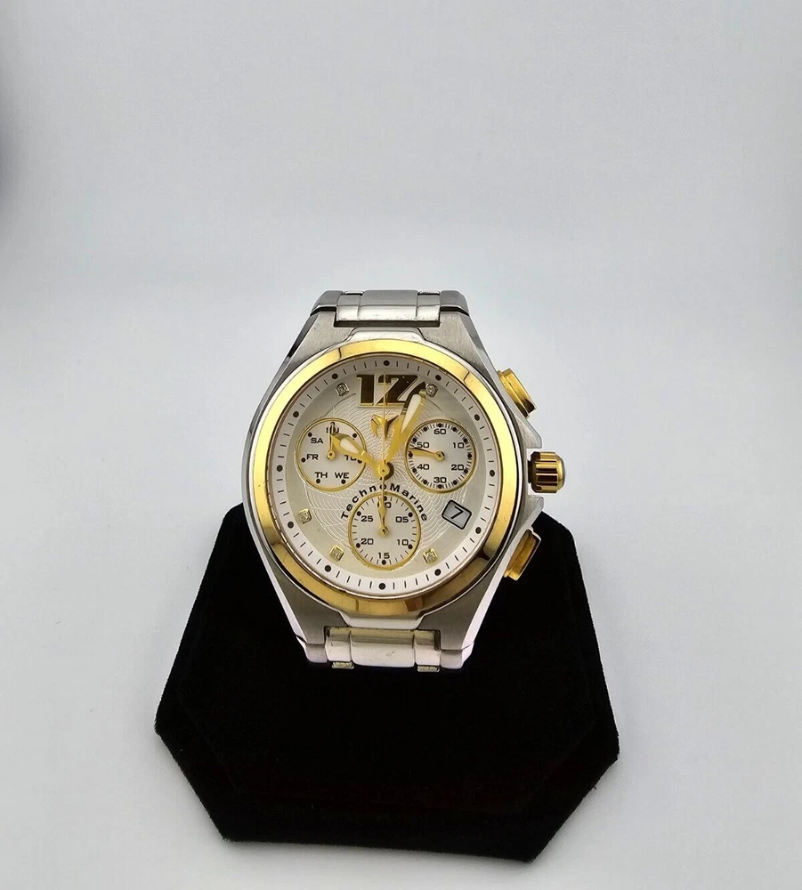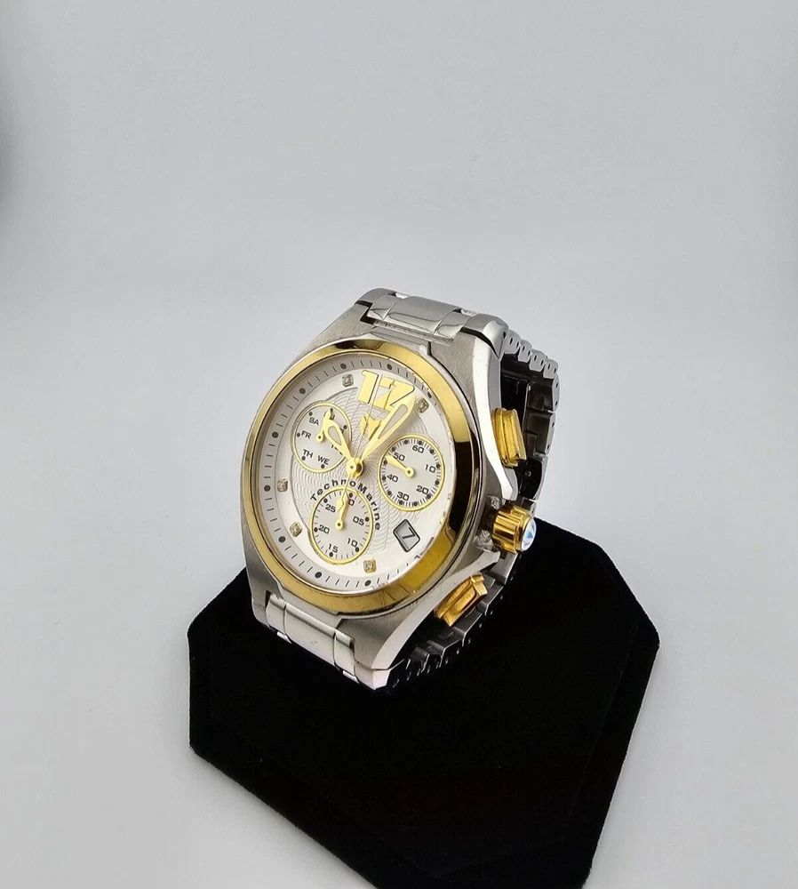 Style: Casual, Dress/Formal, Luxury, Sport Type: Wristwatch Model: TMNC UPC: Does Not Apply Bezel Color: Gold Case Size: 41 mm Display: Analog Reference Number: TMNCGW05M Dial Color: White Country/Region of Manufacture: Switzerland Features: Chronograph, Water-Resistant Movement: Quartz Band Color: Silver Brand: TechnoMarine Case Material: Stainless Steel Case Color: Silver gtin13: Does Not Apply Department: Men Water Resistance: 100 m (10 ATM) Band Material: Stainless Steel