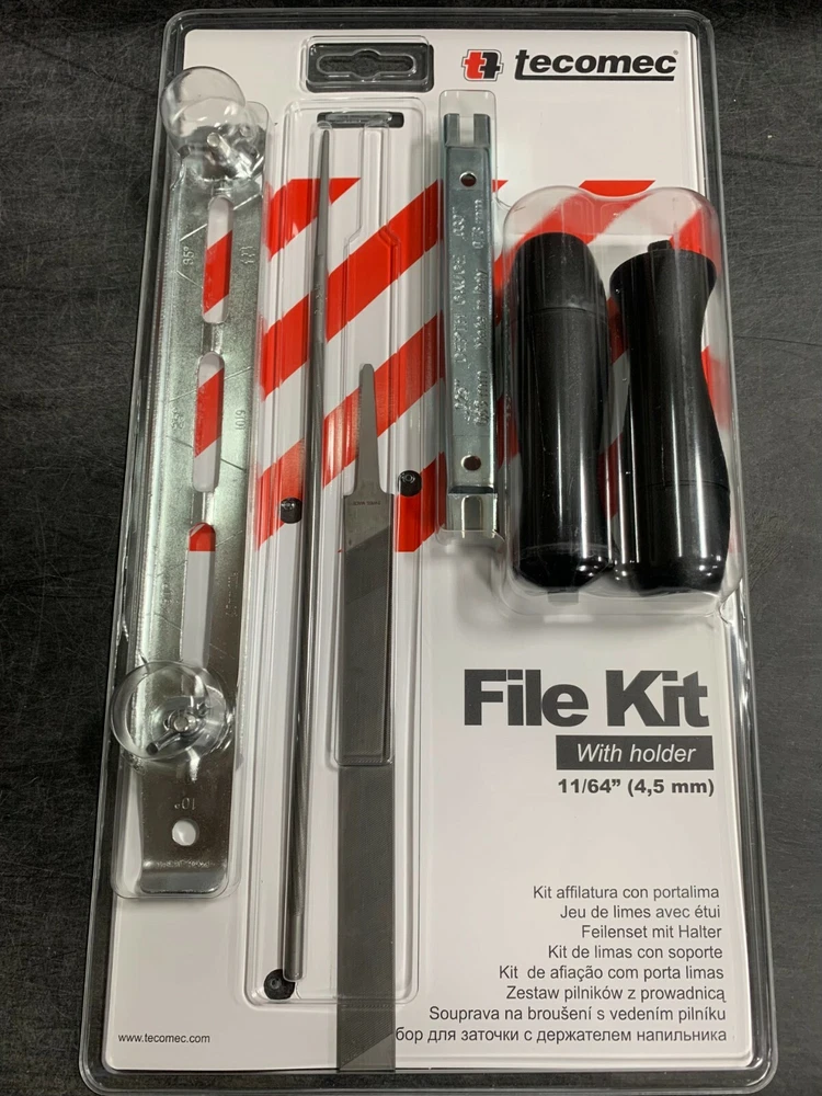 Tecomec Deluxe Chainsaw Sharpening kit, this kit is used to sharpen .325 chisel chain. This filer comes with a 11/64" file, however you can use any size chainsaw round file in file holder. This professional high quality filing kit comes with the chainsaw chain filing guide (file holder), (1) 11/64" chainsaw round file and (1) 6" flat file for depth gauges, both these files are "top" quality Vallorbe Swiss made files! Also included is (2) filing handles one for each file and (1) depth gauge tool made in Italy. The kit also includes filing instructions. To order this same kit that includes (3) 7/32" files please see our listing number: 385864725634 We have a limited supply of these so when there're gone there're gone! Tecomec is an Italian company established in 1985 and is located in the Reggio Emilla region, this area is renowned worldwide for its top in quality technology. Tecomec also has locations in China, France, United States, South America, Maroc and South Africa. Tecomec is a company of the Emak Group which, in turn, belongs to the Yama Group with over 30 companies affiliates and represents the biggest Italian group engaged in the design, production and sales of farming, gardening and forestry applications.