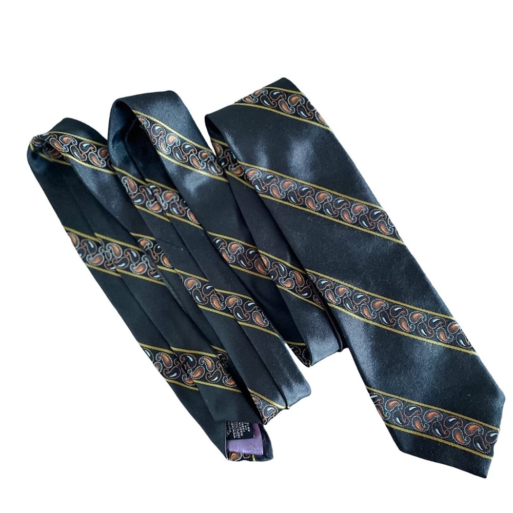Rad Ted Baker London Paisley stripe 100% silk retro theme slim tie! Ted says “get knotted”! •Size: 3” w x 60 l •Condition: Excellent •Color: 70s reminiscent black blue rust brown green-gold (oro verde) Bundle for combined shipping! Pictures/video are part of the description. Measurements are approximate and for guidance. ALL preowned items can be expected to show normal signs of wear. Smoke free, DOG FRIENDLY home. 10% of net sales go directly to charity at my local food bank.