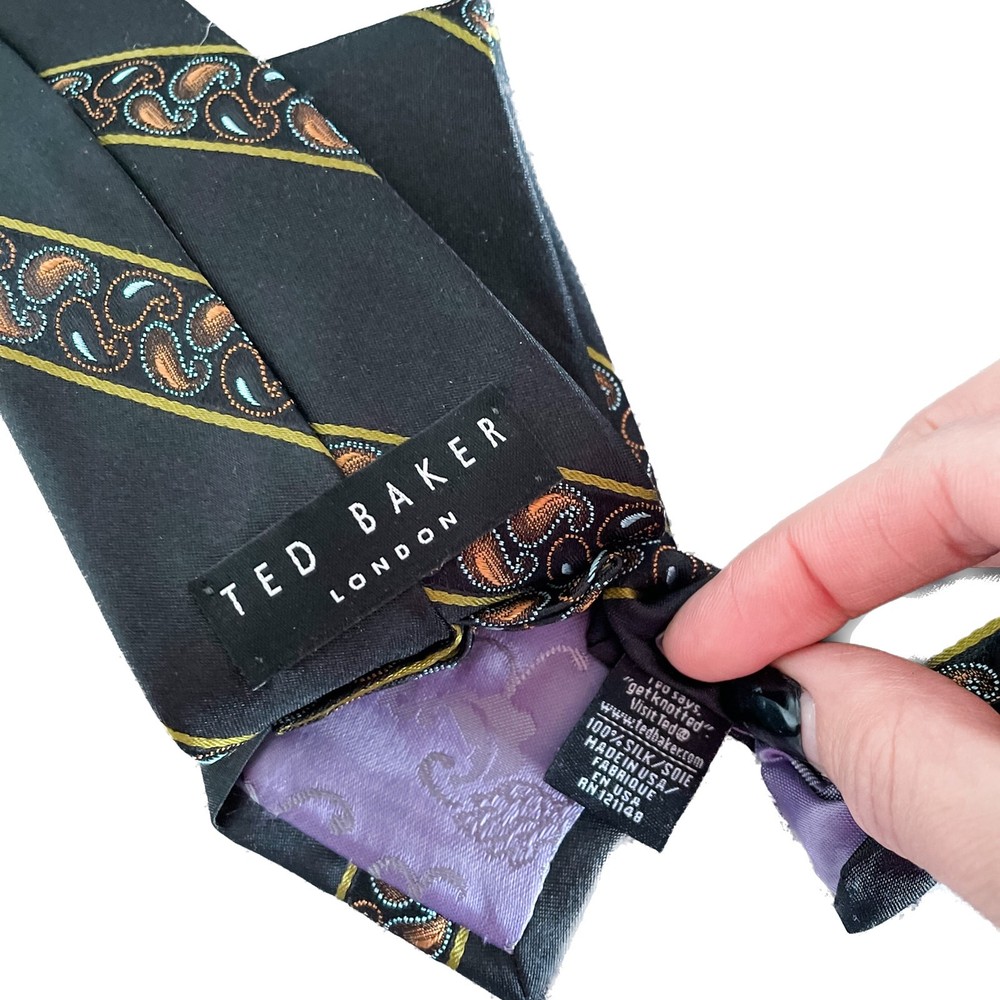 Theme: Retro Material: 100% Silk Style: Slim Tie Color: Black Seller Notes: “Reminder: always click to read the full description :)” Department: Men Type: Tie Brand: Ted Baker London Item Length: Classic (57"-60") Pattern: Paisley Item Width: Skinny