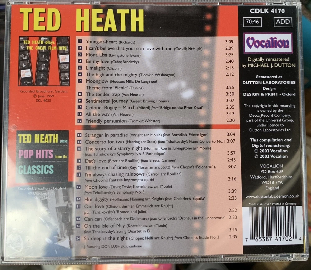 This audioCD features the legendary Ted Heath's compilation of great film hits and pop hits from the classics. Released in 2002 by Vocalion, this CD is a must-have for any fan of classical pop music. The English language CD comes in an audioCD case and is perfect for collectors or those who appreciate the timeless melodies of classic films. The CD includes a variety of genres, from the upbeat and energetic to the slow and emotional. The musical arrangements are flawless, showcasing the incredible talent of Ted Heath and his orchestra. This CD is a true gem for any music lover and is sure to provide hours of listening pleasure. Red