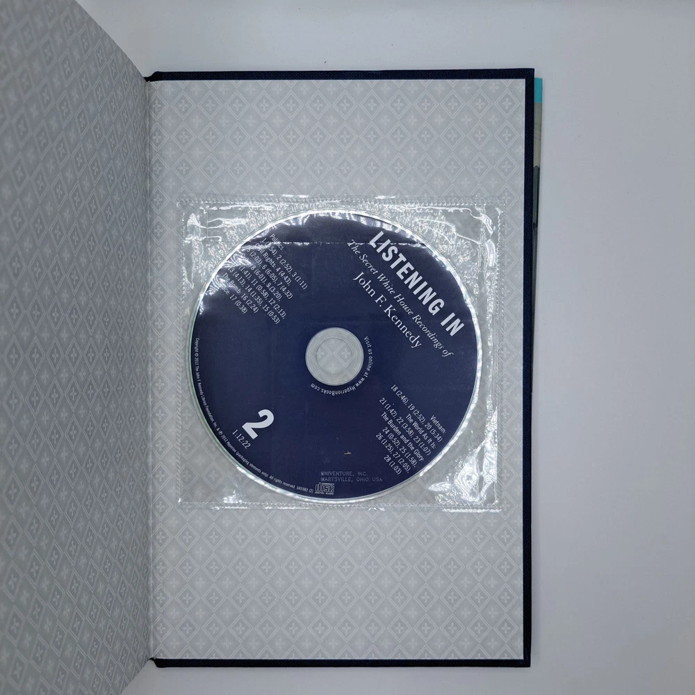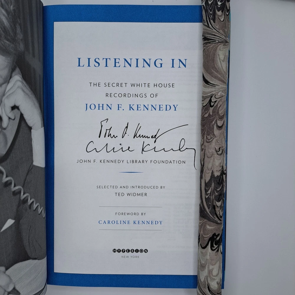 LISTENING IN: THE SECRET WHITE HOUSE RECORDINGS OF JOHN F. KENNEDY [Signed] Author: Widmer, Ted [Editor]; Kennedy, Caroline [Foreword] Title: LISTENING IN: THE SECRET WHITE HOUSE RECORDINGS OF JOHN F. KENNEDY [Signed] Publication: New York: Hyperion, 2012 Edition: First Edition, First Printing Description: Octavo, 300 pages. In Near Fine condition with a Near Fine dust jacket. Blue and white spine with white, blue, and black text. Dust jacket is protected with a mylar covering, price uncut '$40.00'. Blue "Includes 2 1/2 hours of audio" sticker on front cover. Dust jacket and boards show minor wear on fore and rear corners and head and tail edges of spine. Contains loose CDs on front and rear paste downs. Signed flat by Caroline Kennedy on title page. Shelved in Hallway. Seller ID: 1389411 Subject: US History Welcome to the eBay store of Second Story Books! DC's Oldest Rare and Used Bookstore, Second Story Books operates two open shops in the Washington D.C. metropolitan area. We have an extensive internet presence and provide accredited appraisals member ASA. This listing was created by Bibliopolis.