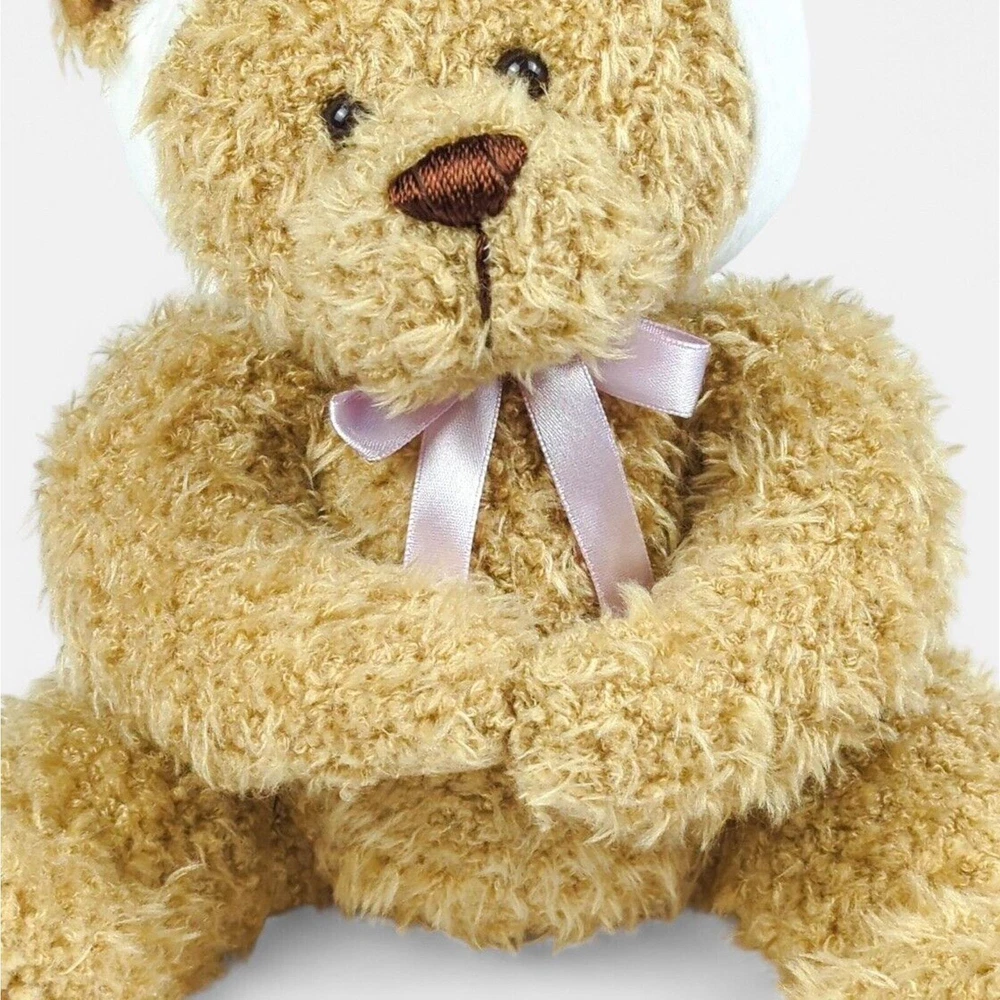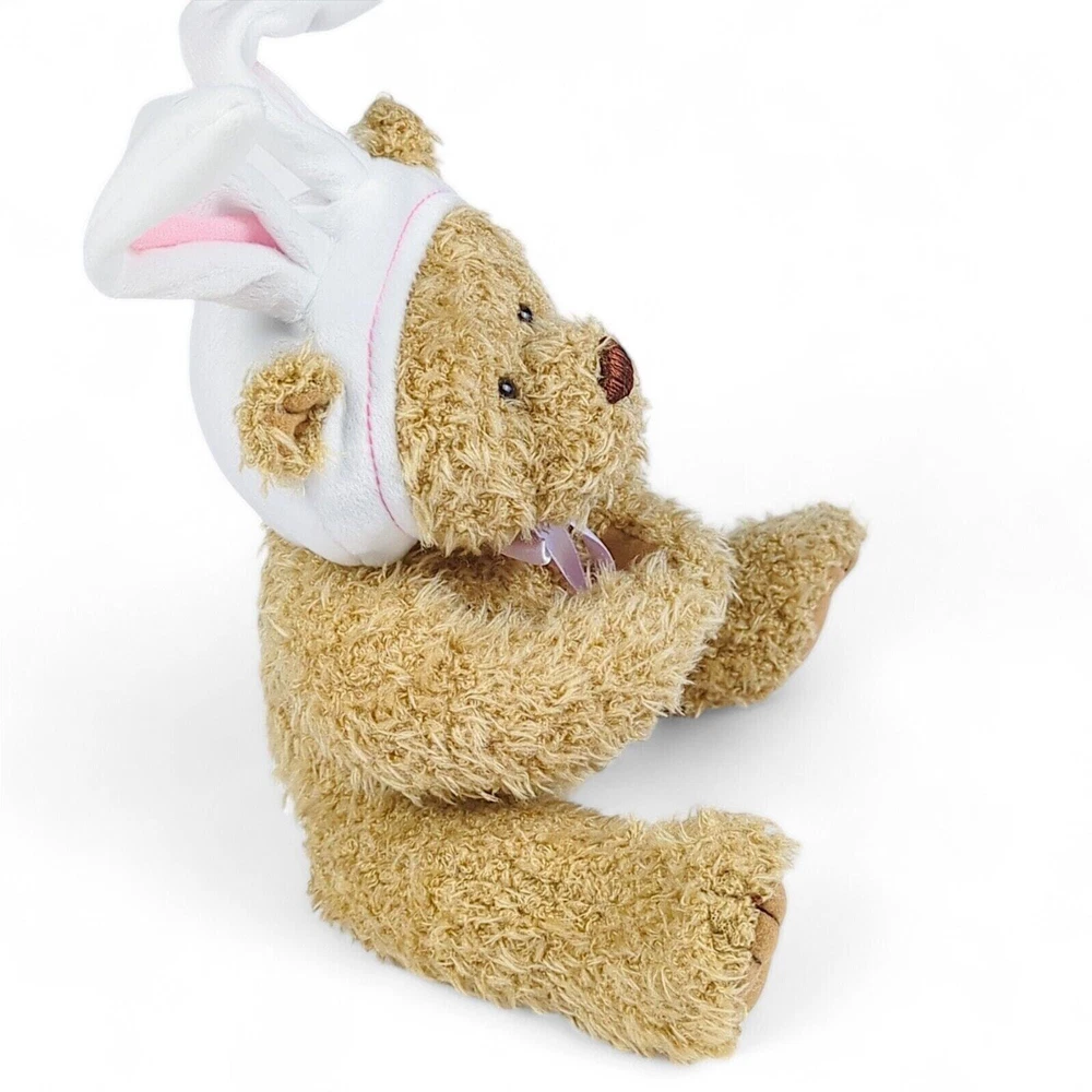 Plush Stuffed Easter Teddy Bear • Brown Bear wearing white bunny ears • Flexible wire in the ears allows you to bend and shape the ears into place • Ear headpiece is tied around the neck with the ribbon, but the bow is attached to the bear's neck and therefore the ear headpiece is not removable • Paws are connected together in front • While seated, bear itself is approximately 9" wide and 8" tall not including ears -- add another 4.5" with ears This is a pre-owned, used item in good condition. No stains, holes, or loose seams.
