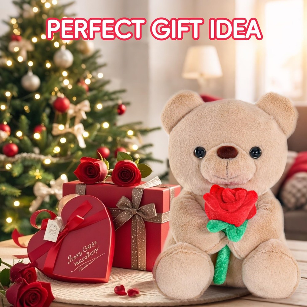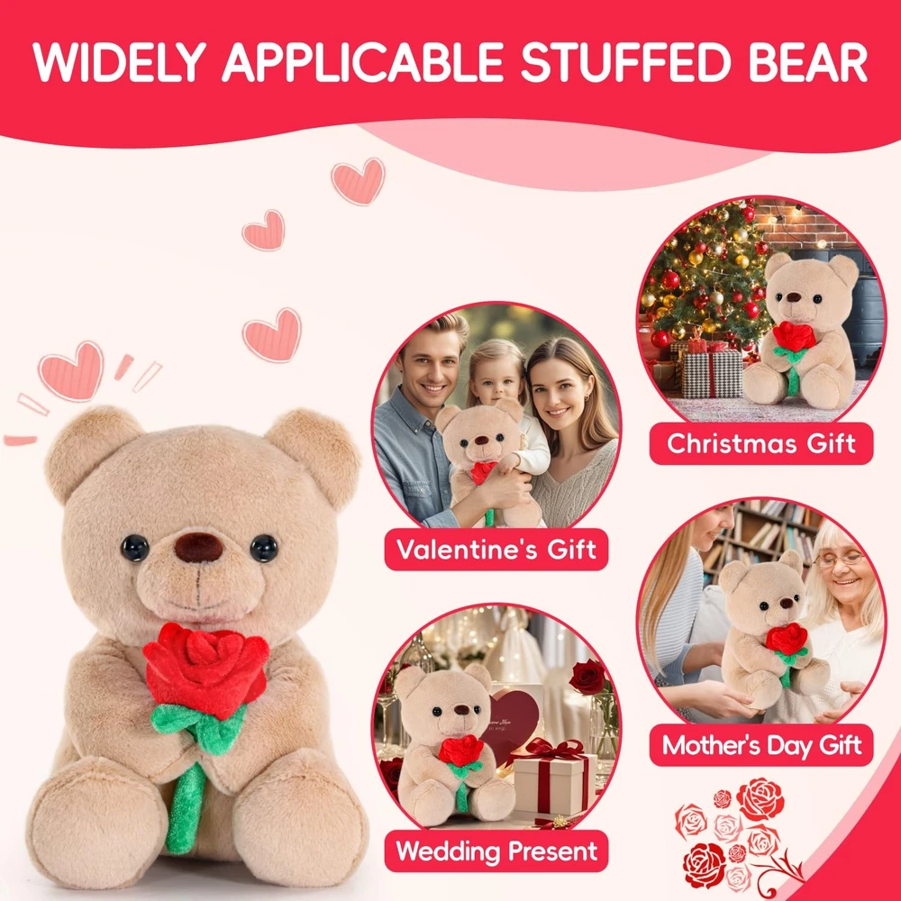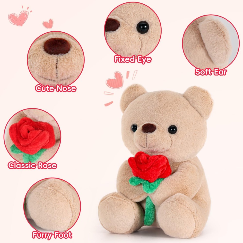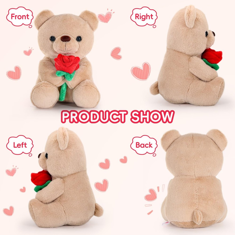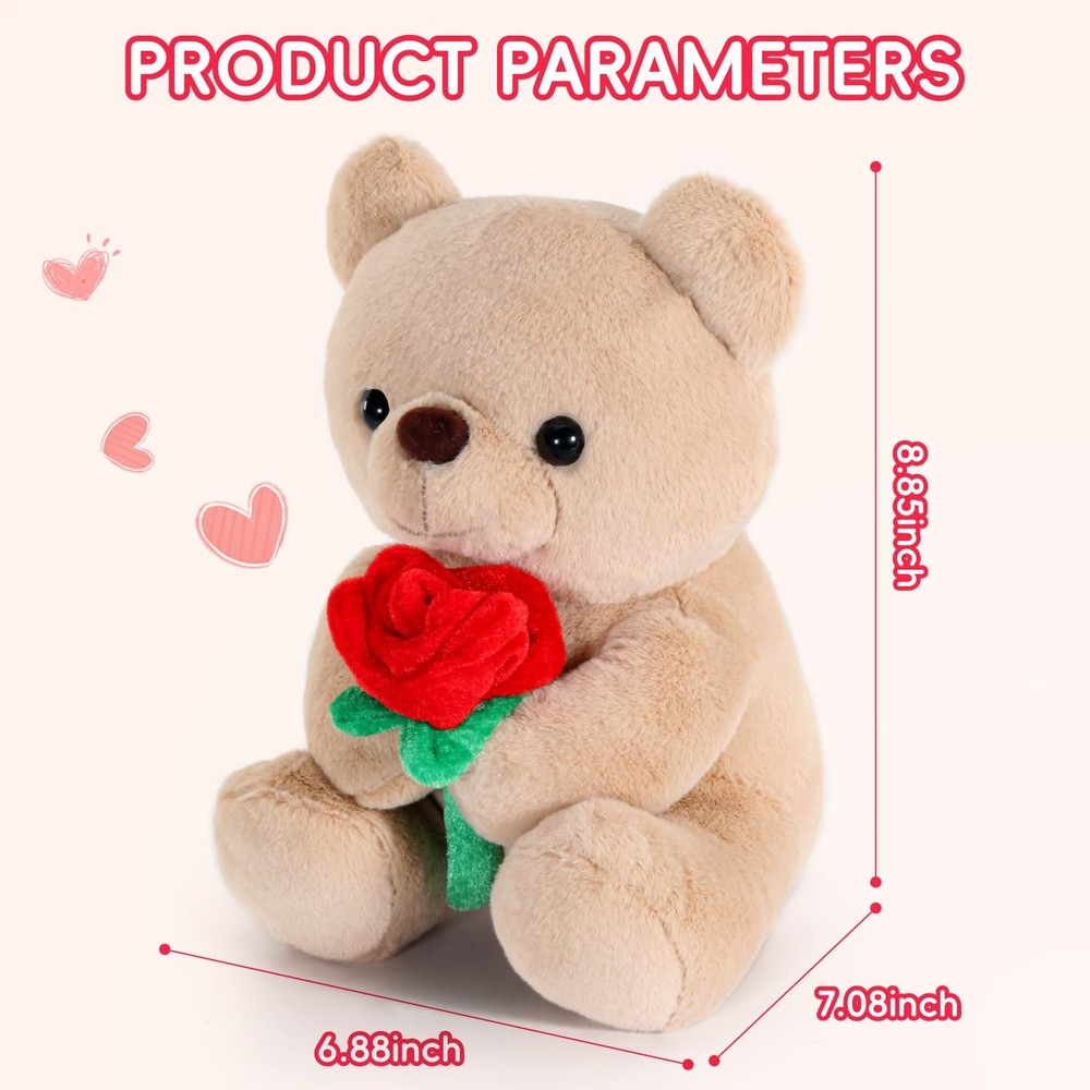 Teddy Bear Stuffed Animal with Rose, 9″ Soft 9 inch, Coffee Description Features: VALENTINES DAY GIFTS FOR KIDS: This teddy bear is a brown color with a red rose, and its shape is playful and cute; You can take it anywhere easily, and it can accompany you and bring you happiness SOFT STUFFING MATERIAL: Each soft cuddle bear is made of polyester fiber and plush material; Moreover, the stuffing is soft and slightly fluffy, you will love to hug it, which gives a feeling of release and happiness DURABLE SAFE CLEANABLE: Instead of traditional glue fastening, pinning technology is used for the eyes to ensure safety and durability, so the eyes are not easy for toddlers to chew or pick off; and the washable surface is constructed for easy cleaning TEDDY BEAR VALENTINES DAY: This soft and fluffy teddy bear plush toy is nice gift for Christmas, Thanksgiving, Easter, and Valentine's Day; stuffed animals are always popular as birthday gifts, baby shower gifts, and kids graduation gifts CUSTOMER FIRST: Each bear is individually packaged in a box to ensure that the product is received in good way; We serve product quality and customer satisfaction; If you have any questions about the products, please let us know, we are always here Product Details: Handling We will ship all orders within 3 business day of payment. Delivery We Do Not Ship Outside of the Continental US. Return Policy All items qualify for returns within 30 days of receipt. Buyer is responsible for return shipping on any item that is not damaged. Feedback We take our reputation seriously, we buy and sell online, so we understand the value of trust. If you are unsatisfied with your order, please contact us and we will work with you to resolve it to your satisfaction.