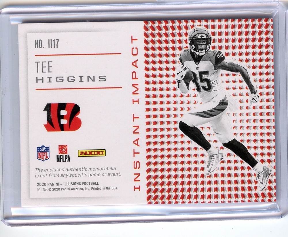 The product is a 2020 Panini Illusions trading card featuring Tee Higgins, a player for the Cincinnati Bengals in the National Football League (NFL). This particular card is part of the Instant Impact Jerseys Jumbo Relic set, showcasing a piece of Higgins' jersey as a memorabilia item. Produced by Panini, a well-known card manufacturer, this football card falls under the modern period category and is an original release from the 2020 season. It is a sought-after collectible for fans and collectors of football trading cards.