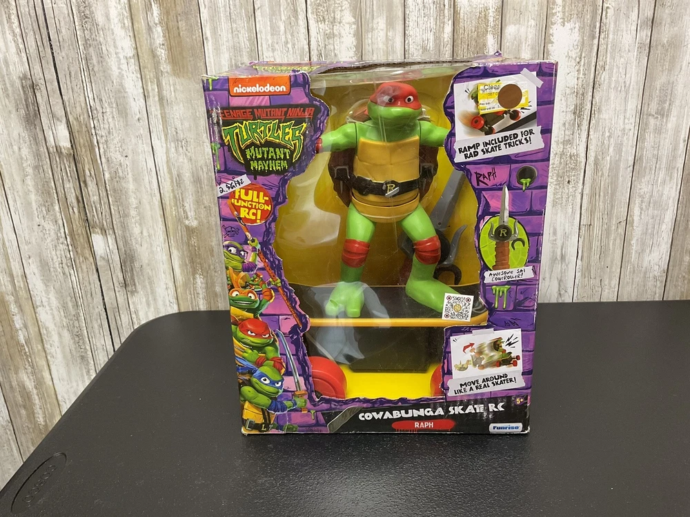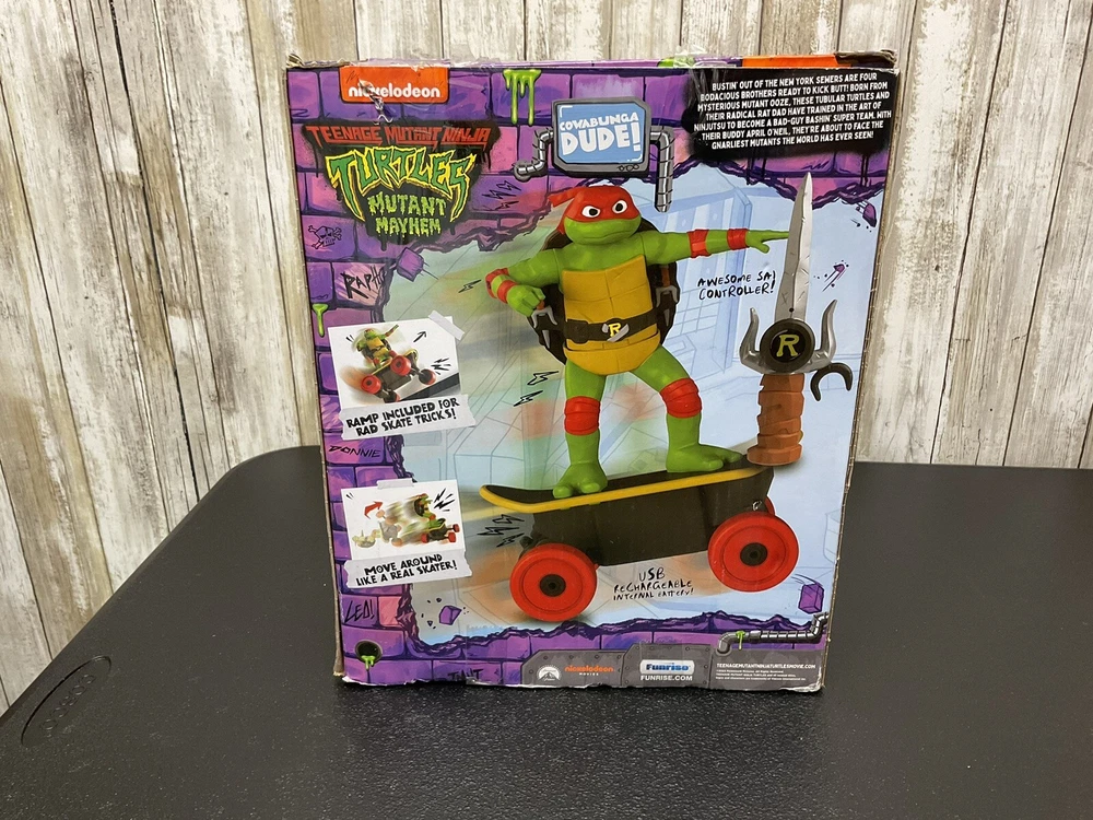 Get ready for some turtle-tastic fun with this Teenage Mutant Ninja Turtles Cowabunga Skate RC Raph action figure! This original, licensed reproduction features a green plastic shell and comes with a remote control for easy navigation. Perfect for all occasions and birthdays, this unit is sure to be a hit with fans of the TMNT franchise. With its cartoon and TV character theme, this action figure is a must-have for any collector or fan. The model number 71039 is unopened and features no customization. Suitable for ages 5 and up, this Teenage Mutant Ninja Turtles action figure is a great addition to any collection.