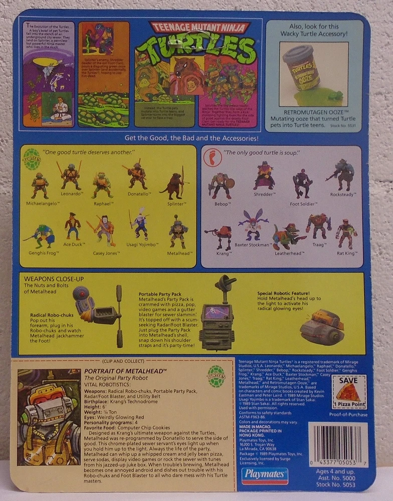 Teenage Mutant Ninja Turtles TMNT Vintage 1989 - Metal Head The Original Party Robot On 19 Back Card By Playmates. Includes Radical Robo-Chuks, Portable Party Pack, And Special Robotic Feature. Mint On Unpunched Card. Minor Wear On The Back Of the Hang Tag. May be AFA Worthy. Great Condition. Please see all photos. As per the Ebay Regulations ---- International Buyers – Please Note: Import duties, taxes and charges are not included in the item price or shipping charges. These charges are the buyer's responsibility. Please check with your country's customs office to determine what these additional costs will be prior to bidding/buying. These charges are normally collected by the delivering freight (shipping) company or when you pick the item up – do not confuse them for additional shipping charges. We do not mark merchandise values below value or mark items as "gifts" - US and International government regulations prohibit such behavior.