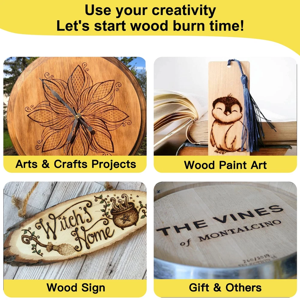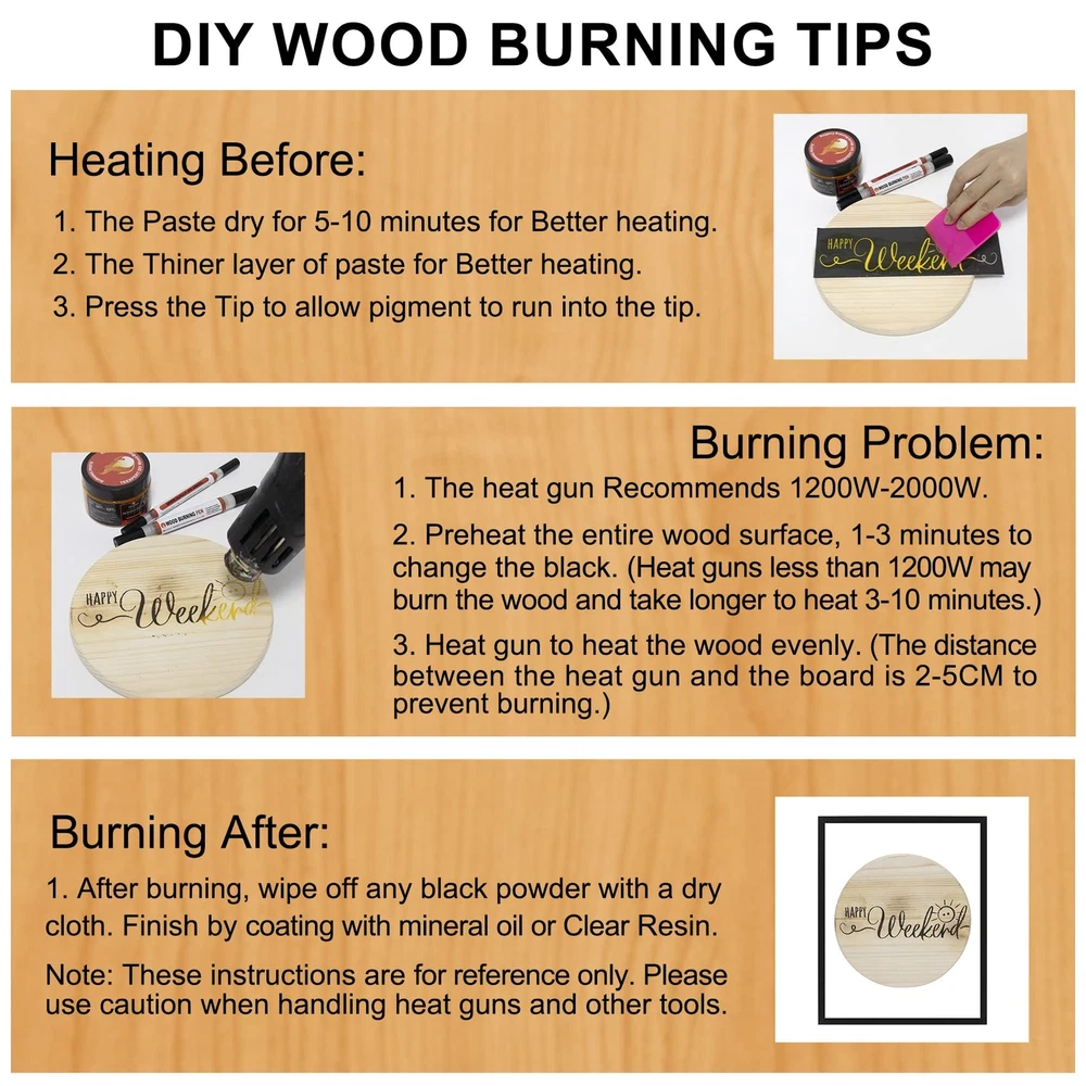 DIY HEAT-ACTIVATED KIT:Transform your wooden projects into stunning works of art with our Wood Burning Kit! Our specially designed kit can burn your designs onto wooden surfaces in just 5-10 minutes. Drawing, heating, and charring are done perfectly, making it a safe, simple, and efficient choice for wood-burning projects. It's perfect for beginners to enjoy creating fun projects at home WOOD BURNING PASTE: With a squeegee and a thin layer of burn paste, 4OZ/125g wood burning gel can be used for drawings on stencil stickers and huge wood pieces. Use a heat gun to burn your design for 1-3 minutes to have the work done. The use of the wood-burning paste is a secure, convenient, and effective solution for traditional heating instruments WOOD BURNING MARKER:Double-Sided scorch pen, The oblique and bullet tips, scorch pen are appropriate for small wooden signage or detailed pattern designs. All you need to do is press the tip of the marker down until ink runs into it and you're ready to start sketching, making it easy for homemade DIY wood projects of both beginners and artists PACKAGE INCLUDES:Teexpert wood-burning gel pen kit includes 1 wood burning paste, 2 wood burning pens, 4 diff-nibs, 1 screen-printing squeegee, and 2 sandpapers. All components are secure and non-toxic, and the paste and ink are both uniforms. Burning designs have never been easier WIDE APPLICABILITY:A NEW HOBBY IS BORN, Our Wood Burning Kit can be used on a wide range of wooden products, from scenes and signs to tables and chairs. It's perfectly ideal for gift-making, crafting, art studios, and more. Perfect gift set for Valentine's Day, Mother's Day(mother day gifts for mom), Father's Day, or Thanksgiving Day