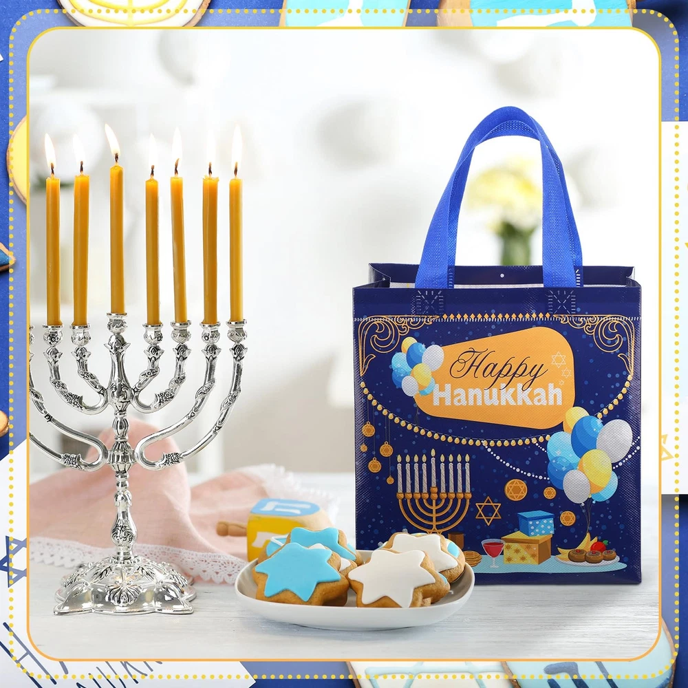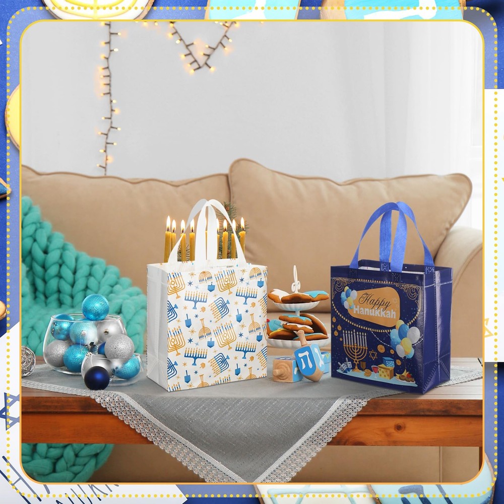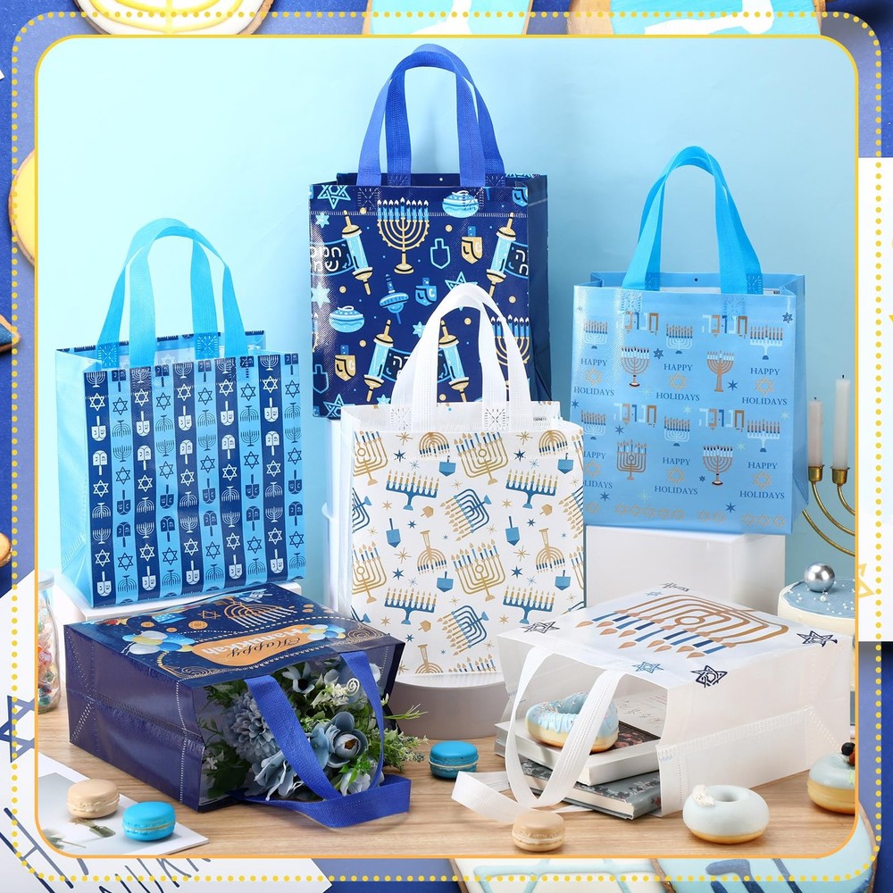 Features: Vibrant Color and Eye Catching Design: These Hanukkah gift tote bags come in the traditional blue color, symbolizing tranquility and spirituality. The hexagrams, candlesticks, and lettering design are intricately designed and shiny, to add a festive touch to your Hanukkah celebrations. The shiny surface captures light and attention, making your gifts stand out Quick and Easy: This is a nice way to quickly wrap a gift, without the trouble of wrapping paper. Will make a bag for those who love to give gifts but don't like to wrap presents. Easy as eating a pie to bring your distinguish gifts to your dear lovers, friends or babies Specifications: Material: non Woven Color: white, navy, blue Size: 9x8.7x4.3 inches Package includes: 24 Pcs Notes: Manual measurement, please allow slight errors on size. The color may exist a slight difference due to different screen displays. Pack of 24 Bags: the package includes 24 Hanukkah reusable bags, which are enough to meet your daily and party uses; It is an ideal choice for Hanukkah parties, family gatherings, and festive events Six Design Styles: including stars, Hanukkah candlesticks, gyroscopes, candles, etc., bring people a warm holiday party atmosphere and impress your guests; These Hanukkah gift tote bags come in the traditional blue color, symbolizing tranquility and spirituality Quality Craftsmanship: the Hanukkah reusable tote bag is Made of non-woven fabric, its sturdy structure and reinforced handle ensure that these bags will not be easily torn, resistant to tearing and wear, ensuring your gifts stay safe and well protected; With easy to carry handles, making it easy to address gifts to friends and family Ideal Dimensions: with dimensions of approx. 9x8.7x4.3 inches, our Hanukkah reusable gift bags with handles offer enough space to tuck in your holiday gifts neatly; Whether it's small toys, candies, books, or clothing, these Hanukkah tote bags can suit a wide range of gift sizes and types, suitable for all your gifting needs Versatility and Utility: these Hanukkah gift wrap bags are not just for Hanukkah gifts; Their elegant design and excellent craftsmanship make them ideal for other occasions, too; You can use these Hanukkah goodie bags at birthdays, anniversaries, and other special occasions for giving gifts or as decorative pieces