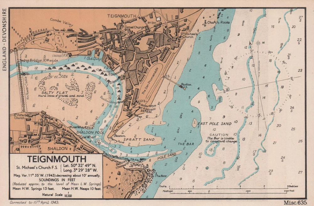 'Teignmouth. St. Michael's Church F.S. Lat. 50� 32' 49" N. Long. 3� 29' 28" W. mag. var. 11� 35'W. (1943) decreasing about 10' annually. Soundings in feet (reduced approx. to the level of Mean L.W. Springs) Mean H.W. Springs 13 feet. Mean H.W. Neaps 10 feet. Natural scale 1/10,550' Vintage colour sea chart, 1943 Title of map: 'Teignmouth. St. Michael's Church F.S. Lat. 50� 32' 49" N. Long. 3� 29' 28" W. mag. var. 11� 35'W. (1943) decreasing about 10' annually. Soundings in feet (reduced approx. to the level of Mean L.W. Springs) Mean H.W. Springs 13 feet. Mean H.W. Neaps 10 feet. Natural scale 1/10,550' The image below shows an enlarged cross section from the centre of the map to show the level of printed detail: DATE PRINTED: Corrected to 15th April 1943 IMAGE SIZE: Approx 15.0 x 22.5cm, 5.75 x 9 inches (Medium) ARTIST/CARTOGRAPHER/ENGRAVER: The British Admiralty PROVENANCE: "English Channel Handbook": 1st Edition; Published by The Hydrographic Department of the Admiralty TYPE: Vintage colour sea chart VERSO: There are images and/or text printed on the reverse side of the picture. In some cases this may be visible on the picture itself (please check the scan prior to your purchase) or around the margin of the picture CONDITION: Good; suitable for framing. However, please note: The image shown may have been taken from a different example of this map than that which is offered for sale. The map you will receive is in good condition but there may be minor variations in the condition from that shown in the image. Please check the scan for any blemishes prior to making your purchase. Virtually all antiquarian maps and prints are subject to some normal aging due to use and time which is not obtrusive unless otherwise stated. I offer a no questions asked return policy - see below. AUTHENTICITY: This is an authentic historic print, published at the date stated above. I do not offer reproductions. It is not a modern copy. The term 'original' when applied to a print means that it was printed at the first or original date of publication; it does not imply that the item is unique. 'Print' means any image created by applying an inked block to paper or card under pressure by any method including wood engraving, steel engraving, copperplate, wood cut and lithography. REMARKS: FRANCE: Gravures et Cartes anciennes. DEUTSCHLAND: Alte Lankarten und Stadt ansichten. ITALIA: Stampe e Mappe antiche. ESPA�A: Mapas antiquos y impresiones antiguas. E and OE. Force Majeure. English law shall apply. RETURNS POLICY: I offer a no questions returns policy. All I ask is that you pay return shipping and mail back to me in original condition, suitably packed & insured, within 14 days of receipt.