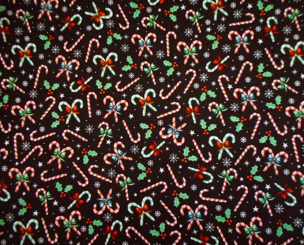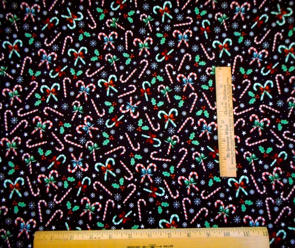 This is a very nice fabric that is 100% cotton. This a premium quilting cotton by Brother & Sister Design Studio. It has candy canes tied with ribbon, holly & white snowflakes on a black background. READ: Because computer monitors show colors and shades differently, the fabric colors can vary from the photos. If you have any questions regarding this, please contact me before p urchasing the item. I have been a quilter for 30 years and am an accomplished seamstress & would be happy to answer any questions you might have. This is for 1 2/3 Yard of Fabric. If you have a problem with anything you purchase from me, please contact me before leaving neutral or negative feedback and I will work it out with you. Payment is due within 48 hours. If payment isn't received within 5 days, it will automatically go to Ebay's resolution center for non-payment. INSTRUCTIONS FOR COMBINED SHIPPING: I Do combine shipping. You must put your items into your shopping cart and request an invoice from me using the request total button before completing the payment process. IF YOU'RE UNABLE TO COMBINE YOUR SHIPPING, PLEASE CONTACT ME. Payment is due upon receipt of your invoice. Thank you for looking and God bless you and your family. IF THERE IS A PROBLEM WITH ANY PURCHASE, PLEASE CONTACT ME, THE SELLER, VIA EBAY'S MESSAGING SYSTEM PRIOR TO OPENING A CASE--OPENING A CASE, EVEN IF RESOLVED SMOOTHLY, CAN HURT THE SELLER'S RATINGS. THANK YOU