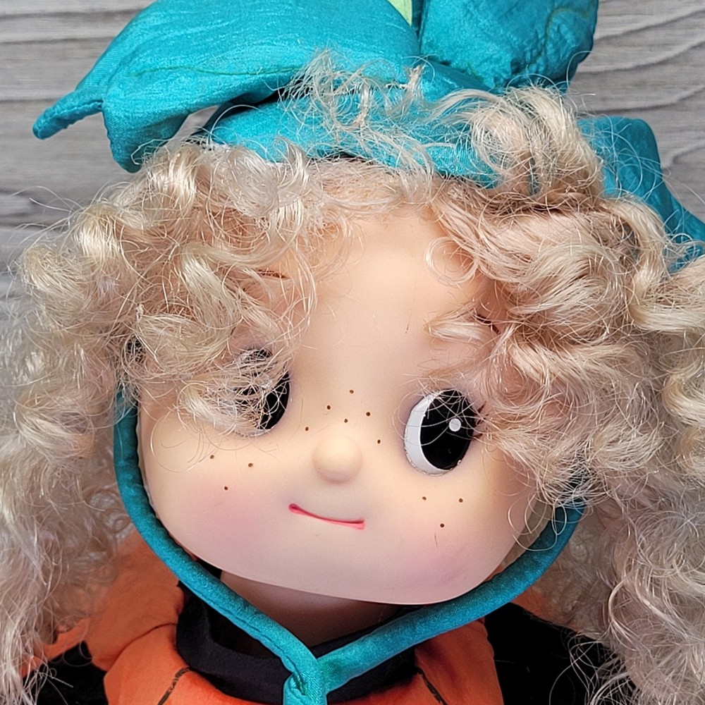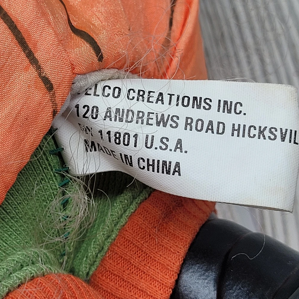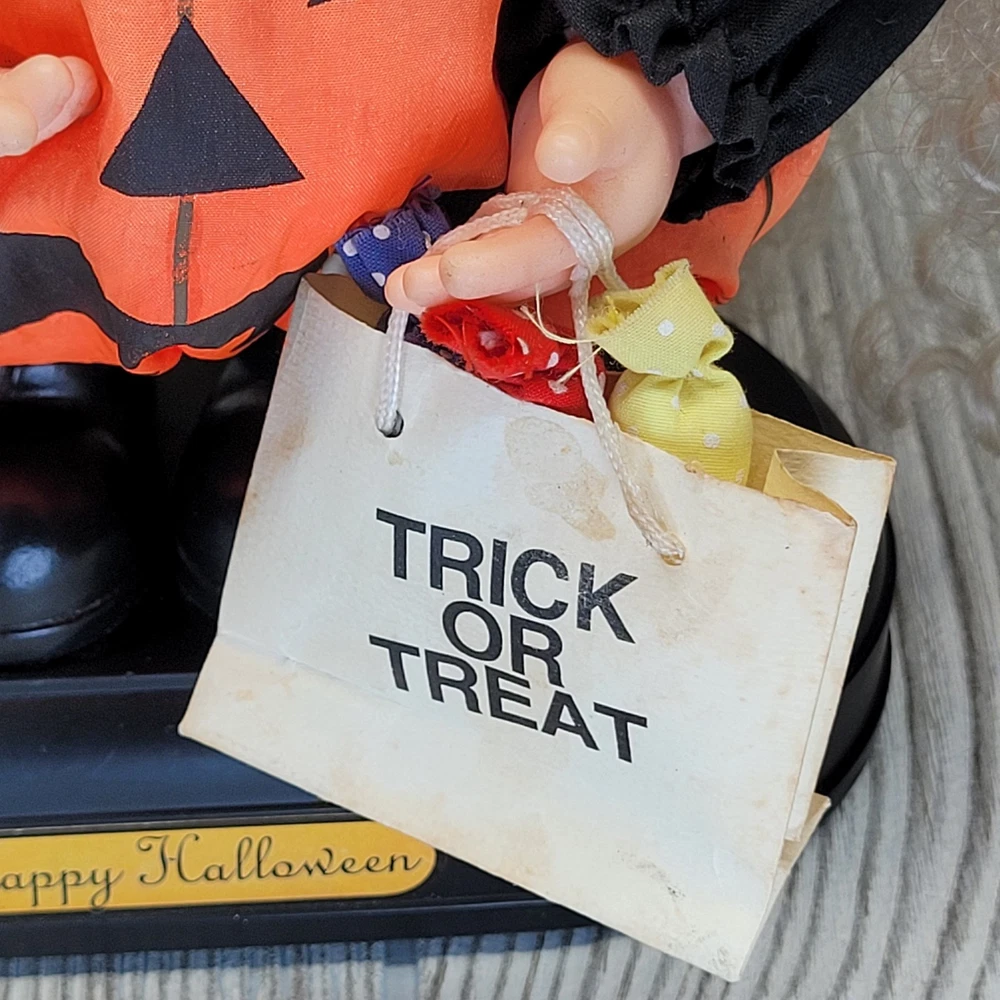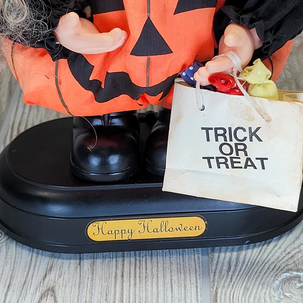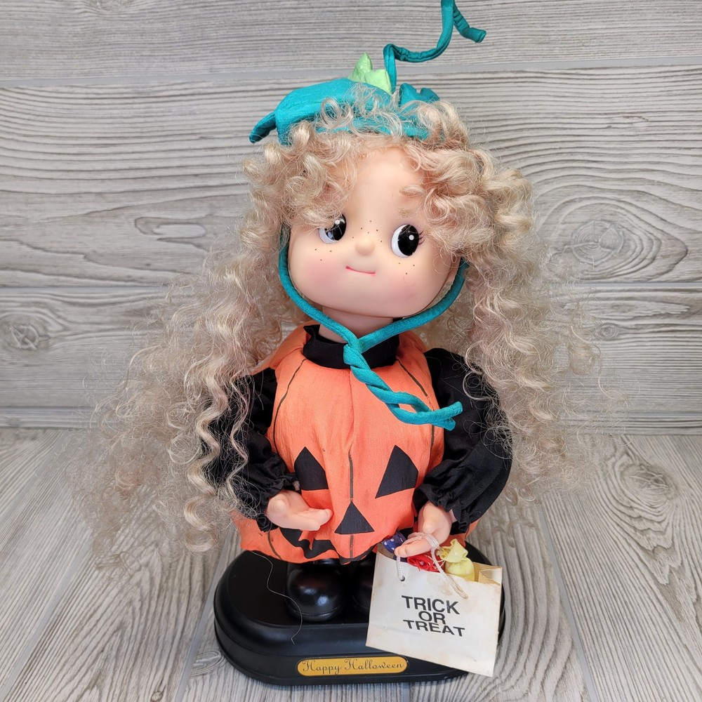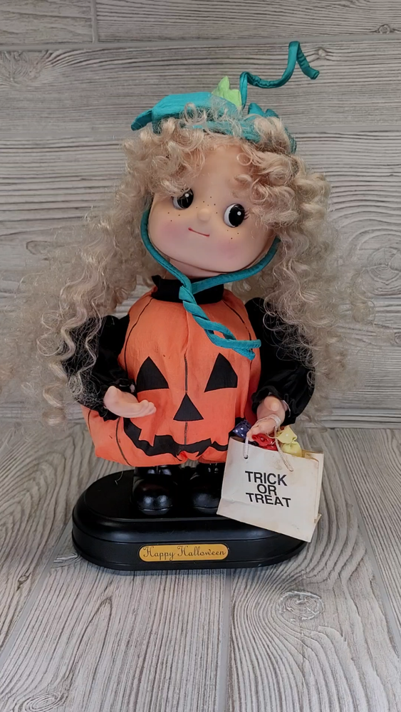 Vintage Telco Creations Halloween Animated Doll in Pumpkin Costume Condition: Used – Light wear, minor signs of age including some discoloration on the trick or treat bag. No major visible flaws. See all photos for details. Features adorable vinyl face with painted freckles, curly blond hair, and large eyes Wears a plush orange pumpkin jack-o-lantern costume with black shirt and shoes Comes with attached "Trick or Treat" bag, includes original bows and fabric "candy" details Unique teal and green stuffed pumpkin vine hat Plastic base with "Happy Halloween" label Animated: This doll moves when batteries are inserted (battery compartment is clean, untested) Model/Stock No. 54220, barcode and label on base Tag reads: Telco Creations Inc., 120 Andrews Road Hicksville, NY 11801 U.S.A., Made in China Marketed by Wal-Mart Stores, Inc., Bentonville, Arkansas Great vintage Halloween decor for collectors or display Doll stands approximately 14" tall with base (see photo with measurement grid for reference) Classic 1990s Halloween animated figure