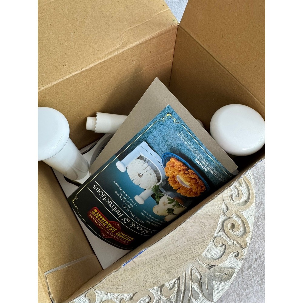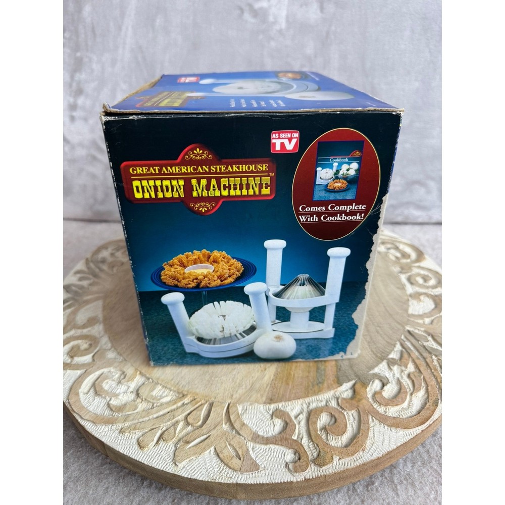 Great American Steakhouse Onion Machine creates restaurant-style blooming onion appetizers in your own kitchen. This manual slicer is designed to handle any size onion, providing a uniform cut for perfect frying or baking results. The unit disassembles easily for compact storage and is dishwasher safe for quick cleanup. Included with the machine is a specialized coring tool and a cookbook featuring recipes for batters and dipping sauces to complete the steakhouse experience. Brand: TeleBrands Model: Great American Steakhouse Onion Machine Color: White Material: Plastic, Stainless Steel Components: Slicer Base, Coring Tool, Cookbook/Instruction Guide Features: Dishwasher Safe, Disassembles for Storage Power Source: Manual Keywords: Blooming Onion, Onion Blossom, Kitchen Gadget, As Seen On TV, Appetizer Maker, Party Food, Restaurant Style, Deep Fryer Accessory, Cooking Tool, Vintage Kitchen, Culinary Gift, Home Chef, Steakhouse Style Thank you for your interest-discountduet