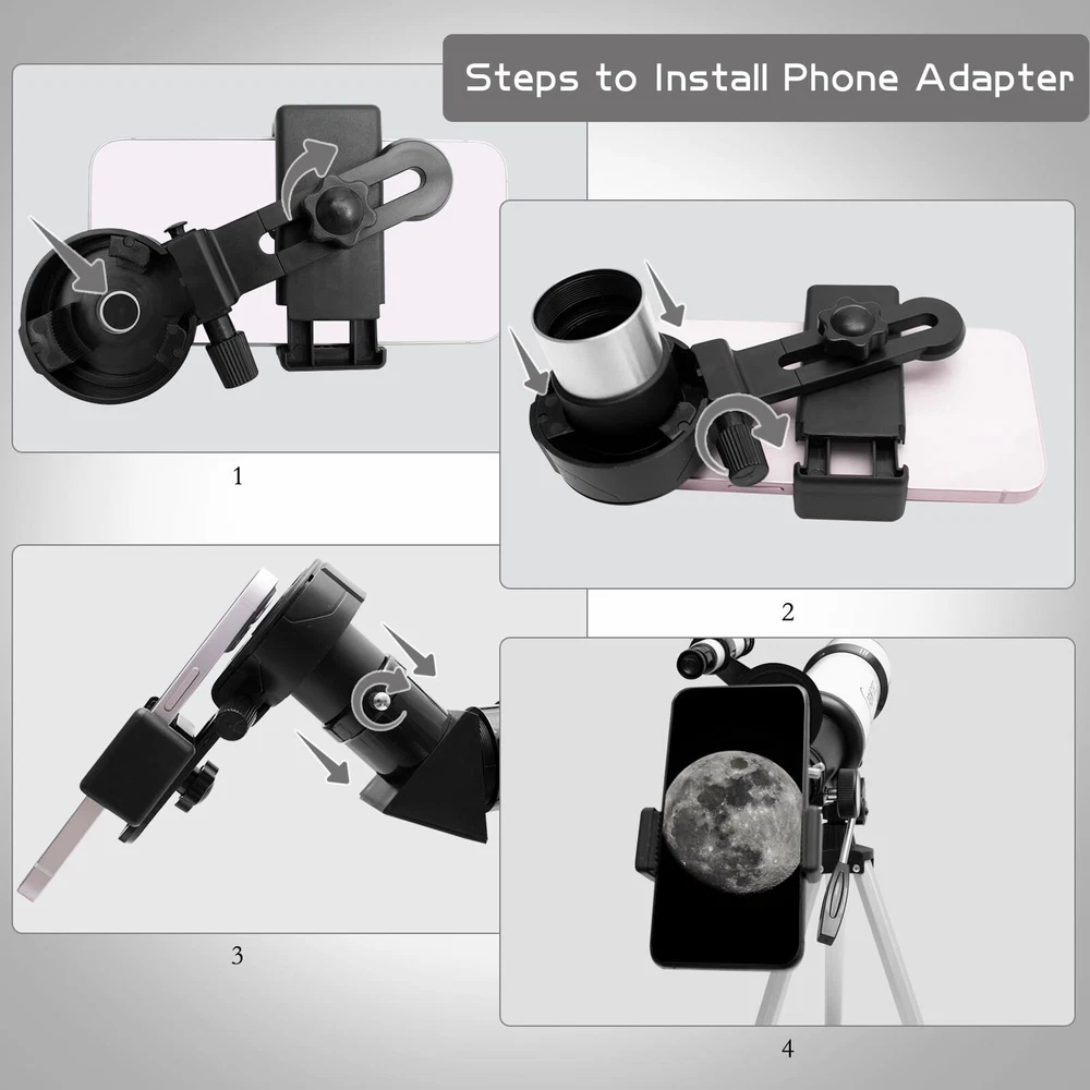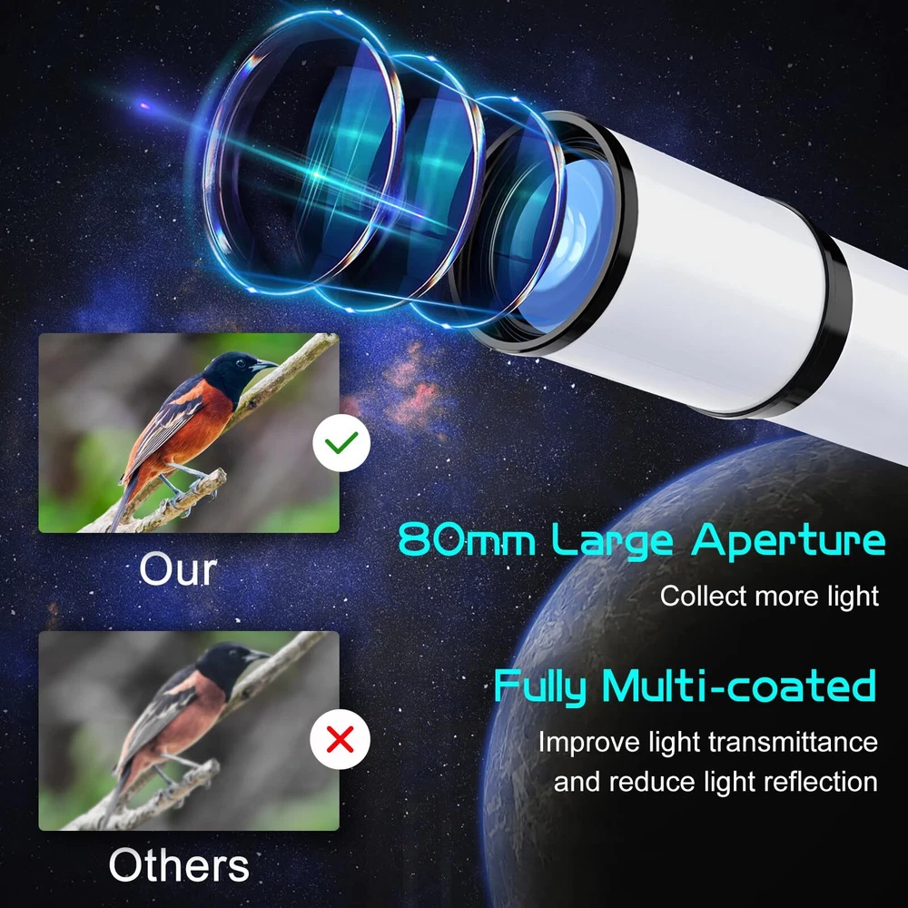80mm Objective Lens Our telescope is equipped with a large 80mm objective lens and the lens is fully coated with high transmission coatings. The large aperture can collect more light and the high transmission optics lens can increase light transmittance and reduce the reflection of light. Compare with other 70mm models, our telescope can get brighter and clearer images. Professional telescopes for adults astronomy can help 8-12 kids & adults & beginners view the planets and stars more easily. High Magnification The telescope has 25X-250X magnification. Our telescope with 500mm focal length, 3 eyepieces(K25mm, K10MM and K6mm) and a 3X Barlow lens. The 3x Barlow lens trebles the magnifying power of each eyepiece. So you can get magnification from 25X to 250X. The magnification is enough to see the moon and planets. It’s a great telescope for adults and astronomy beginners. Portable Telescope for Travel The refractor telescope has a bag and an adjustable tripod. The tripod is stable and it can be adjusted from 22” to 48’’. The tripod also has a tray, which is convenient for you to replace and store eyepieces. All accessories can be put into the bag, which is convenient for you to carry when you go out and travel. Our telescope set also includes a smartphone adapter and a wireless remote. The phone adapter is the latest, which can let your phone attach to the telescope more stably, so you can take some photos easier through your phone. Easy to Assemble and Use This telescope is quick and easy to set up. We have a full set of manual and a video installation guideline. Don't worry about any installation problems. Even the kids and astronomy beginners can install it by themselves without any tools. It’s a great astronomy gift for astronomy beginners. 3 Years Customer Service provide a 3-year customer service. If you have any question about the products and service, please feel free to contact us, we will do our best to help you in 24 hours. 【80mm Large Aperture】The telescope has an 80mm aperture and a fully coated optics lens. The big aperture can capture more light, the high transmission optics lens can improve light transmittance and reduce the reflection of light, so the telescopes for adults astronomy will bring you more bright and clear images. 【25X-250X High Magnification】The telescope equipped with 3 eyepieces(K6mm, K10mm, K25mm) and a 3X Barlow lens. The 3x Barlow lens trebles the magnifying power of each eyepiece. You can get 25X-250X high magnification with a 500mm focal length. Whether observing moon or viewing planets, our telescope can meet your all needs. It’s a great telescope for adults & 8-12 kids & astronomy beginners. 【Portable & Stable】Our refractor telescope has a bag and an adjustable tripod. All accessories can be packed into the bag, which is convenient for you to carry out. The tripod is stable and the height can adjust from 18.1” to 44.9’’, which can be used in many different viewing positions. The tripod also has a tray for easy replacement and storage of eyepieces. 【Easy to Use】 The telescope is easy to assemble even for astronomy beginners and kids. We have the detailed installation manual and video installation instructions to teach you. Our telescope set includes the upgraded phone adapter and wireless remote. The mobile phone can be attached to the telescope more stably, which is convenient for you to take some amazing photos through your phone. It’s a great astronomy gift for beginners and it will encourage them to love learning about space. 【Satisfaction Service】We provide 3 years satisfaction service. If you are not satisfied with our product or have any questions, please feel free to contact us to get 24-hour technical support from our expert team.