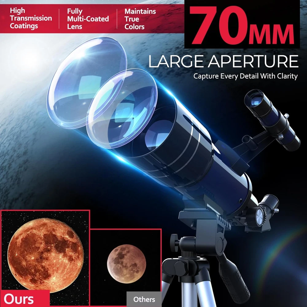 Store New Arrivals Add to Favorite View Feedback Contact Telescope for Kids, 70Mm Aperture (15X-150X) AZ Mount Telescopes for Astronomy Beginners, Portable Refractor Telescope with Tripod, Phone Adapter and Wireless Remote, Dark Blue Description Optical Tube Length 70 Millimeters Optical-Tube Length 70 Millimeters Eye Piece Lens Description Barlow Item Dimensions D x W x H 13.8"D x 2.8"W x 2"H Color Dark Blue Mount Altazimuth Mount Item Weight 1.7 Kilograms Number of Batteries 1 CR2032 batteries required. (included) Objective Lens Diameter 70 Millimeters Product Dimensions 13.8"D x 2.8"W x 2"H Telescope Mount Description Altazimuth Mount 【15X to 150X Magnification】This astronomical telescope boasts 3 eyepieces (K20mm, K12mm and K6mm), and 3X and 1.5X Barlow lenses, allowing for magnifications ranging from 15X to 150X. Enjoy clear views with a 70mm aperture and fully coated optics glass lens. The lenses also feature scratch-resistant coatings to enhance durability. 【Great Gift for Kids】The kids telescope can be used to observe the Moon and bright planets,but also good for daylight viewing of wildlife. Perfect Christmas or birthday gift for kids 8-12, 5-7 and astronomy beginners. The telescope for adults helps children build interest in astronomy and science, exploring the unknown, enjoy the nature and away from screen. 【Easy to Assemble and Adjust Viewing Angle】Assembling the space telescope is a breeze, even for beginners and kids. We provide a detailed installation manual and video instructions to guide you. The adjustable tripod ensures stability and can be set at heights ranging from 13.5 to 47.6 inches, accommodating various viewing positions. 【Wireless Remote & Phone Adapter& Moon Filter】Our telescope for kids & adults comes equipped with a smartphone adapter and a wireless camera remote for seamless connectivity. Simply attach your phone to the adapter, connect it to the eyepiece, and start capturing breathtaking images while exploring the wonders of nature. The included moon filter enhances your observation experience by providing brighter, clearer views of the moon while protecting your eyes from glare. 【Quality and Satisfaction Guaranteed】: Our beginner telescope is perfect for stargazing, birdwatching, and exploring wildlife. With a commitment to your satisfaction, we offer a 2-year warranty and 24-hour technical support from our expert team. You can confidently explore the cosmos with our reliable product. Product Description The video showcases the product in use. The video guides you through product setup. The video compares multiple products. The video shows the product being unpacked. 1 Multi-Angle Rotation 2 Phone Holder Setup Steps 3 45° Diagonal Mirror 4 Moon Filter 1 15X-150X Magnificatons 2 Large Aperture 1 Adjustable Tripod Tube 2 Finder Scope 3 Diagonal Mirror 4 Three Eyepieces 5 3X Barlow Lens ABOUT US We offer the best prices around on high quality products. Our E-store includes media such as books, movies, music and games while offering electronics, toys, sporting apparel, clothing, tools, general home, garden items and more. SHIPPING We are always working hard to ensure your package arrives as soon as possible. Please understand that some factors like weather, high postal traffic, and the performance of shipping companies are outside of our control. We offer free shipping to the lower 48 states and ship within 2 business days of payment, usually sooner. We do not accept P.O. Boxes. Please provide a physical address. For shipping outside of the continental USA, we only use eBay's Global Shipping Program.The item is shipped to KY and then sent to the rest of the world. International customers are responsible for all duties and taxes. Continue to check out in order to calculate costs for shipping the item to your country. Messages regarding eBay's Global Shipping Program MUST be directed at eBay EXCLUSIVELY. RETURNS We offer a 30-Day Return Policy on items which you are not completely satisfied with. You have the option for a full-refund or an exchange of the item. No returns are available on items shipped outside of the USA. PAYMENT We accept PayPal. CONTACT US This page content is yet to come Please ad us to your favorite seller and visit again later Thank You CUSTOMER SATISFACTION We try our very best to make sure every customer is completely satisfied. If there's a problem, message us! We're happy to help. WE ACCEPT Copyright © 2021 AutoDS. | All Rights Reserved