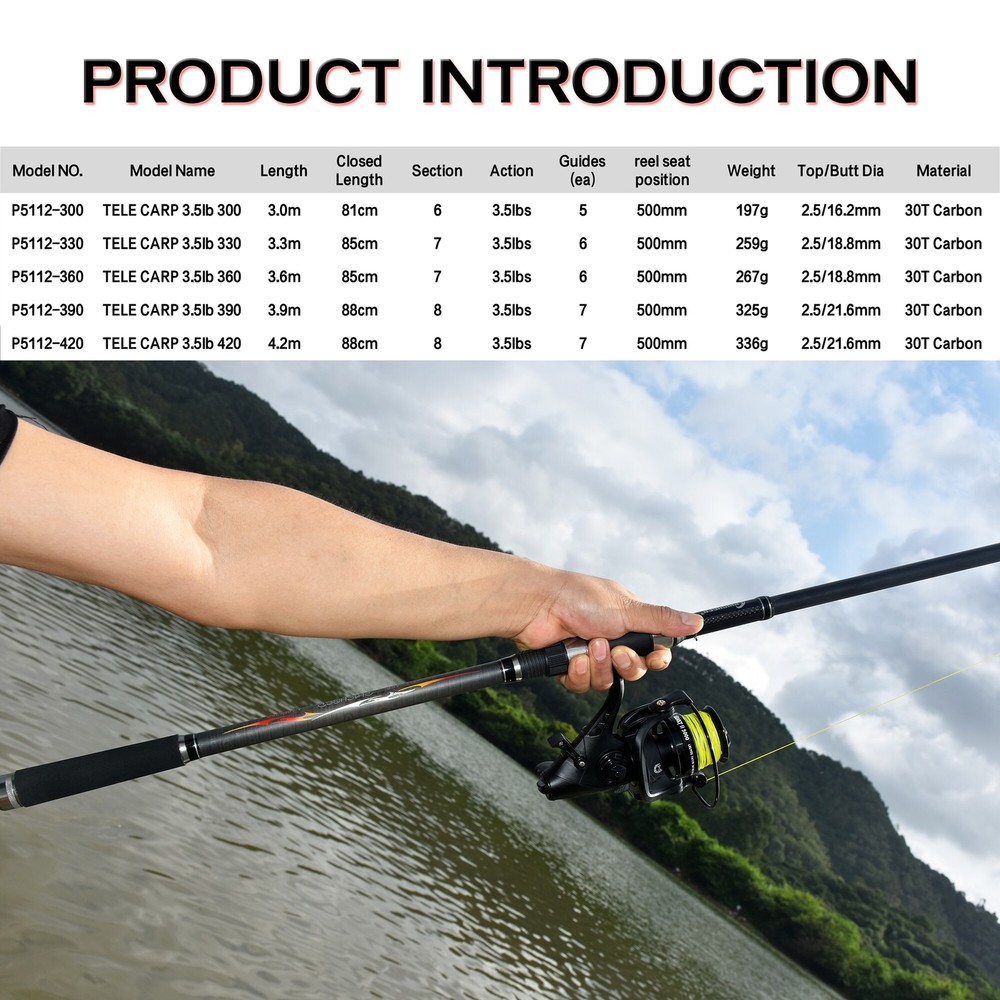 Telescopic Carp Fishing Rod 3.5lbs 3.0/3.3/3.6/3.9/4.2m 1.Made of 30T carbon fiber cloth, the waist is strong, the fishing weight test value is as high as 6kg; 2.High elasticity solid rod slightly, refuse to break; 3.The wheel seat distance is 50cm and 160g is easy to cast; 4.Top ring uses a thickened magnetic ring, which is super wear-resistant and smooth; the largest guide ring is 25#, and the wire exits smoothly; 5.Special part is made of 3K carbon cloth, which is durable and beautiful; 6.The inner diameter is matte bare rod, which is lighter; 7.Each guide ring uses an anti-collision O-ring to prevent bumps and damage; 8.Equipped with a U-shaped hook, which is convenient for hanging fish hooks; 9.Nylon roll seat, lengthened HOOD, non-slip, more comfortable grip; 10.High hardness EVA grip, wear-resistant, non-slip; 11.Exquisite gun-color electroplating tail piece, wear-resistant and anti-collision; 12.High-strength PVC pipe packaging and transportation, please rest assured to buy.