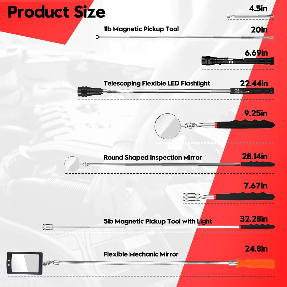 [Telescopic Magnetic Pickup Tool Set] - Retractable magnet flashlight with inspection mirror, comes with telescopic pole and neck mirror, the length of the hand pole can be adjusted according to your needs, the mechanical mirror has 2 super bright LED lights, with 360 degree rotation Double ball joints for easy inspection of hard-to-reach areas. Mirrors can be bent and fixed in fixed directions and lighting. [Easy to carry] - The telescopic inspection mirror is a good tool to meet your inspection needs, with a telescopic pole, the length of the hand-held pole can be adjusted according to your needs, and can be reduced to the smallest size after use, which is convenient to carry and store. [Comfortable Design] - The small observation mirror contains a metal frame design, which can be clipped into a shirt pocket when not in use or needs to be carried; not only is it light and convenient, it can also be used as a decoration; the grooved buffer handle provides a comfortable and tension-free holding experience, allowing You can easily check and adjust your makeup. [Wide Use] - The LED flexible inspection mirror can help you find small items and reach nooks and crannies, making it a practical addition for tool makers, machinists, inspectors, dentists, makeup artists and machinists. The inspection mirror can be stored in the garage, In toolbox, vehicle, car, dresser or bag. [Cool Gadget Gift] - Exquisite gift idea, suitable for women, wife, girlfriend, mother, mom, female mechanic, men, Valentine's Day gift, Christmas gift, anniversary, birthday gift for dad, boyfriend, father's day gift, Christmas gift, christmas stocking stuffers. Product Description