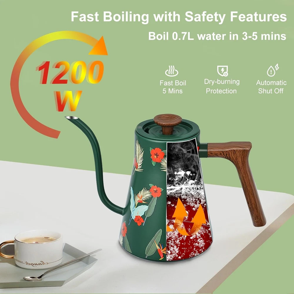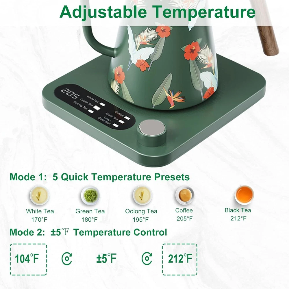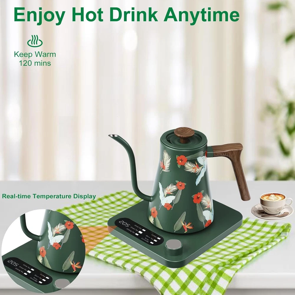 Product Description Gooseneck Electric Kettle - 1200W Quick Boil, Temp Control with 5 Presets & ±5℉ Adjustment, Accurate Pouring, 24oz Small Pour Over Coffee & Tea Kettle, 2H Auto Keep Warm, Stainless Steel, Green Elegant Walnut bringing Nature indoors - The Gooseneck Electric Kettle combines timeless elegant style with modern functionality, featuring a unique walnut grain and a vibrant green printed stainless steel body. Ideal for both traditional and contemporary kitchens, this hot water electric kettle serves as the perfect addition for tea and coffee lovers alike. PS: Unique craftsmanship creates a one-of-a-kind walnut grain. Variable Temperature Control - Tailor your brewing experience with ajustable temperature settings. This electric kettle with temperature control offers 5 presets and the ability to fine-tune the temperature in 5°F increments, ranging from 104°F to 212°F (40℃ to 100℃). Perfect for different types of tea, pour-over coffee, and other hot beverages, ensuring you extract the maximum flavor from every cup. Gooseneck Spout for Accurate Pouring - Achieve a precise, controlled pour with our gooseneck spout, ideal for the art of pour-over coffee brewing. The design facilitates a perfect flow rate for even coffee saturation and enhanced flavor extraction, making it a crucial tool for both novice and professional baristas. Fast Boiling with Safety Features - Equipped with a 1200W heating element, the electric kettle for boiling water heats up quickly, reducing wait time. It also includes safety features such as automatic shut-off and boil-dry protection to ensure safe operation every time, making it a reliable choice for daily use in busy households. Versatile and Gift-Ready - Sawlece gooseneck kettle is not only great for home use but also makes a thoughtful gift for any occasion. It’s versatile, suitable for making multiple types of hot beverages including tea, coffee, and more. The automatic 2h keep-warm feature ensures your water is ready when you are, adding convenience to your brewing routine. About Us We are a reputable seller with many years of experience selling on eBay. Our goal is to provide high-quality products and excellent customer service. Shipping Items will be shipped within 1-3 business days when we received payment. (Orders are not processed on weekends & holidays) Tracking information will be sent once item is shipped. Delivery time depends on destination and other factors Item is shipped to ebay address. Leaving correct address can minimize delay. For international shipping and shipping to Guam, Hawaii and Alaska, Please contact us before placing the order. International buyers please note: Import duties, taxes and charges are not included in the item price or shipping charges. These charges are buyer’s responsibility. We will try our best to reduce the risk of the custom duties. Local pick-up is unavailable at the moment. Contact Us We reply any email messages within 1 business / working days(off-duty at weekend). If you do not get a response from us, then please check your junk or spam mailbox. Our Business hours: Mon-Fri 9:00-18:00, UTC/GMT +8 hours. Please contact us either by clicking "contact seller" in the "purchase history" section or simply click "ask a question" at the bottom of this page. If you are unsatisfied with our item or service, please contact us before leaving any feedback. We are committed to resolve all issues in a friendly and satisfactory manner.