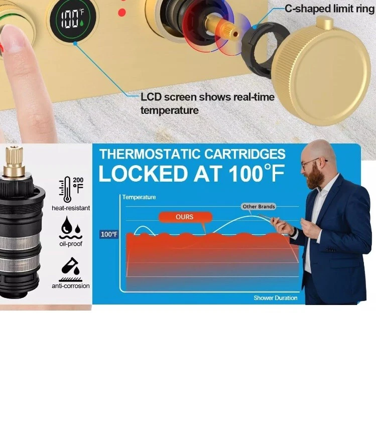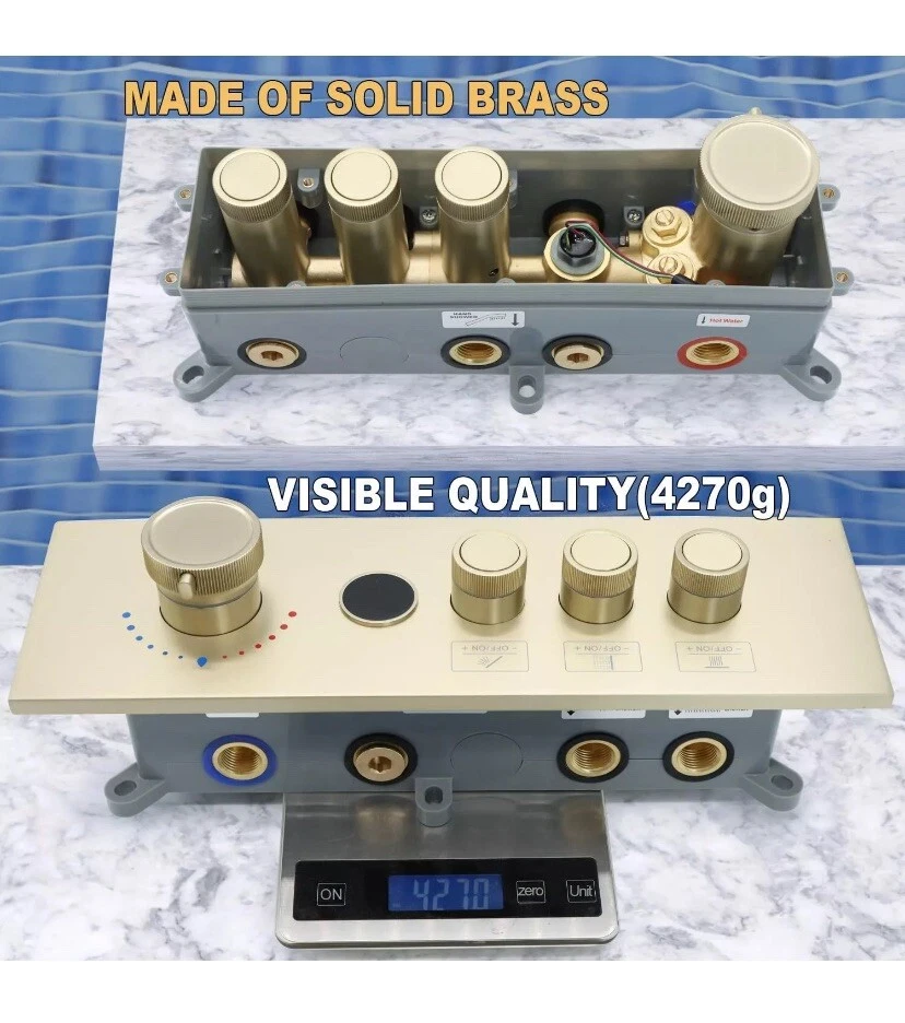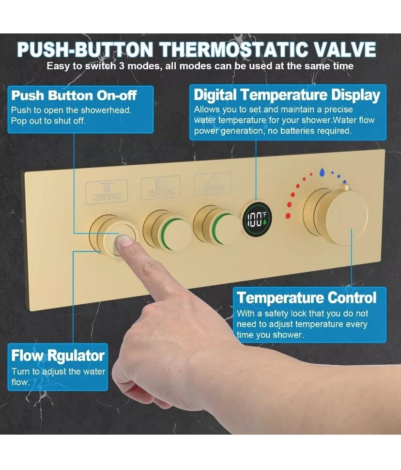 Temperature Display Shower Mixer Valve, 3 Way Push-Button 3-way, Brushed Gold About this item 【Digital Temperature Display】This 3-way digital thermostatic shower valve provides precise temperature control, water flow customization, safety features, and convenience, enhancing your showering experience. The current real-time water temperature from the LED display of the shower valve. 【Push Button On-off & Flow Control】3 way shower diverter valve combines push-button and flow regulation concepts. Each button is equipped with a flow regulator, when you press the button switch, you can turn the regulator left or right to adjust the flow. Moreover, the three button-style diverters on the valve allow for multiple modes to be used at the same time. 【Thermostat Shower Mixing Valve】The digital thermostatic valve allows you to set and maintain a precise water temperature for your shower. Universal thermostatic shower valve, pressure balancing shower diverter avoids the discomfort caused by sudden changes in water temperature and is very suitable for the elderly or children, which features scald prevention, more considerate for your family. 【Generous Flow Rate】Water flow rate at 80 psi: Use one function is 3.83 gpm, 2 functions use together is 4.32 gpm, 3 functions use together is 4.45 gpm. 3-way shower valve, American standard NPT threads, 3 outlets and 2 (hot or cold) inlets are 1/2". 【Easy to install】This shower mixer valve is engineered for easy installation and maintenance. The embedded box design, say goodbye to the trouble of removing the wall for maintenance. Solid brass material + high-quality surface treatment can ensure the quality and service life of the product.
