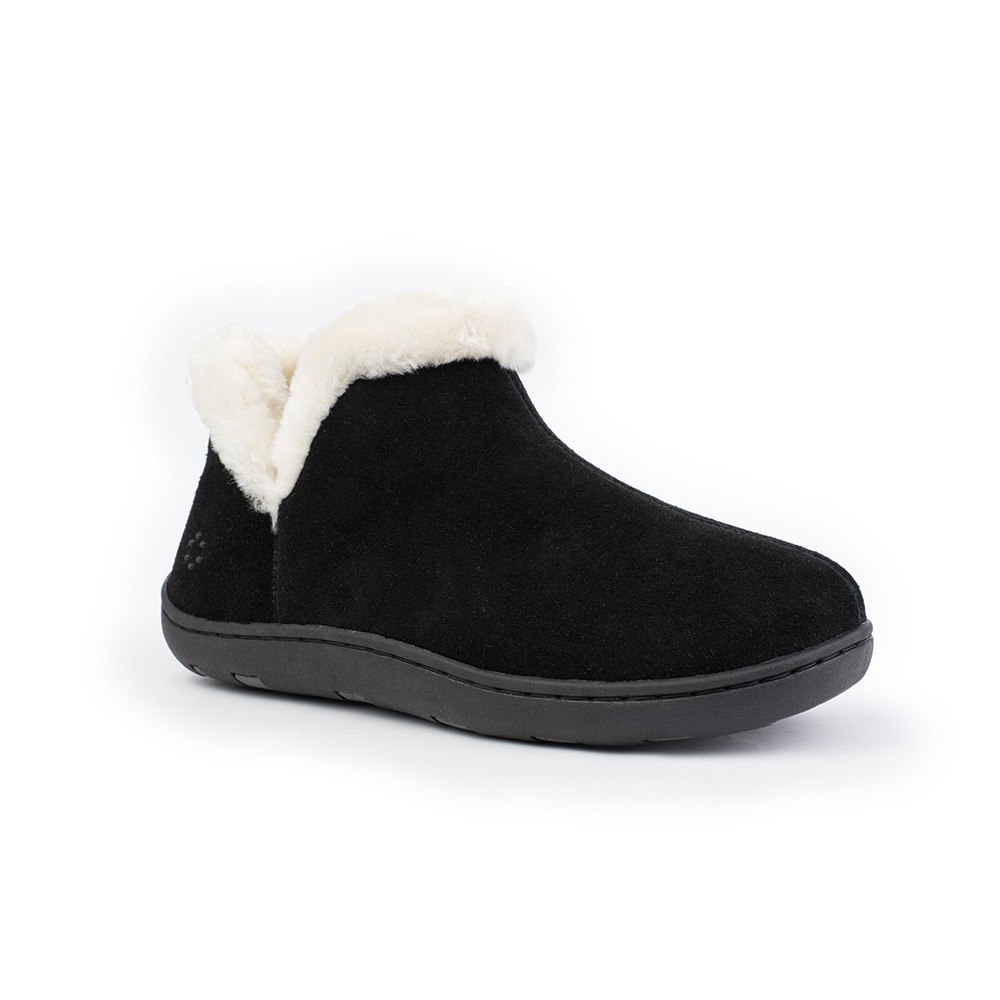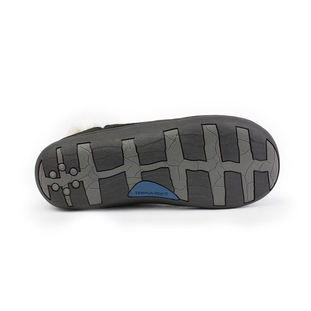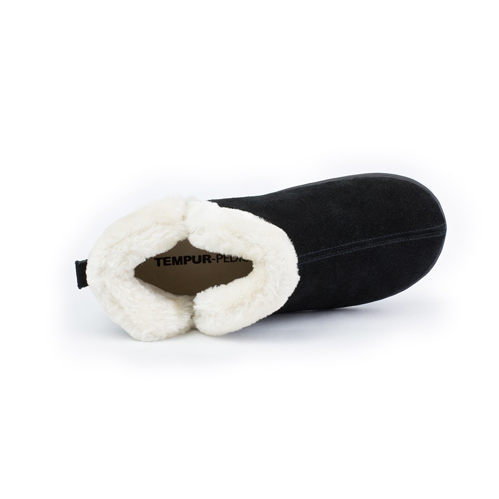 Vallery Bootie Slippers Product Details Suede Leather Upper Faux Fur Collar Fleece Lining Tempur Pedic Cloud Footbed Polyurethane foam for stability The Vallery is a bootie slipper with genuine suede upper and faux fur collar trim. It is constructed with a fleece liner to keep you cozy and warm. Featuring a Cloud footbed with Tempur foam for cushion and a second layer of polyurethane foam for stability. Features an outsole for both indoor and outdoor use. Additional Details Color: Black Occasion: Casual Gender: Womens Age: Adult Brand: Tempur-Pedic