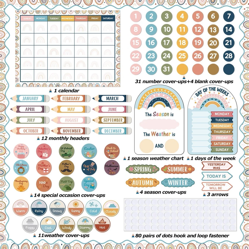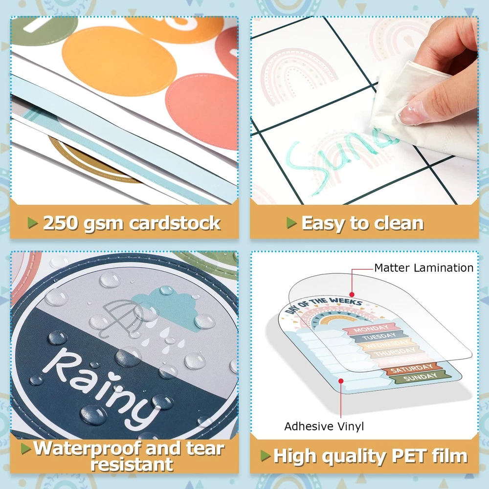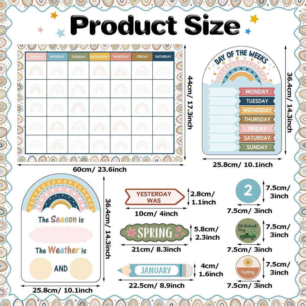 Features: Quality material: These colorful calendars for the classroom are made of quality cardstock, covered with quality PET film for added durability, waterproof, tear-resistant and reusable, nice printing technology makes every card is vibrant and colorfast, please rest assured to buy. Flexible design: Full of innocence with bright colors and cartoon patterns, these bulletin board sets are very suitable for classroom decoration, libraries, learning centers, and after-school programs, come with round stickers, flexible design easy to change the date and weather. Specifications: Material: card stock Size: about 17 x 23 inch Quantity: 162 pieces Color: as shown in the picture Package includes: 1 x Calendar 31 x Number cover-ups 4 x Blank cover-ups 13 x Occasion cover-ups 12 x Monthly headers 1 x Season weather chart 1 x Days of the week 6 x Weather cover-ups 4 x Season cover-ups 9 x Decorative cover-ups 3 x Yesterday, today and tomorrow cover-ups 80 Pairs of round stickers (2 rolls) Note: Manual measurement, please allow little size errors. The words of the products are for decorative purposes only, not applied as a trademark. Package include: you will get 1 calendar, 1 season weather chart, 1 days of the week, 31 number cover ups, 4 season cover ups, 4 blank cover ups, 14 special occasion cover ups, 12 monthly headers, 11 weather cover ups, 3 yesterday, today and tomorrow cover ups; This calendar bulletin board set also includes 80 pairs of hook and loop, easy to change the date and weather Size Details: the calendar is about 17 x 23 inch in brights style calendar bulletin board set is ideal for decorating bulletin boards in the classroom or home as study or planning supplies Reliable material: these positive posters for the classroom are made of quality cardstock, covered with PET film for added durability, waterproof, tear-resistant and reusable, nice printing technology makes every card is vibrant and colorfast, and with no odd Wide applications: these colorful calendar boards are suitable for preschool, elementary, middle, high school, libraries, learning centers, they are a wonderful addition to classroom supplies Chic design: these calendar sets have various styles for you to choose, and a font design with bright colors, the vibrant design can fully attract the attention of students and help to increase their curiosity about the world, good helper for classroom decoration