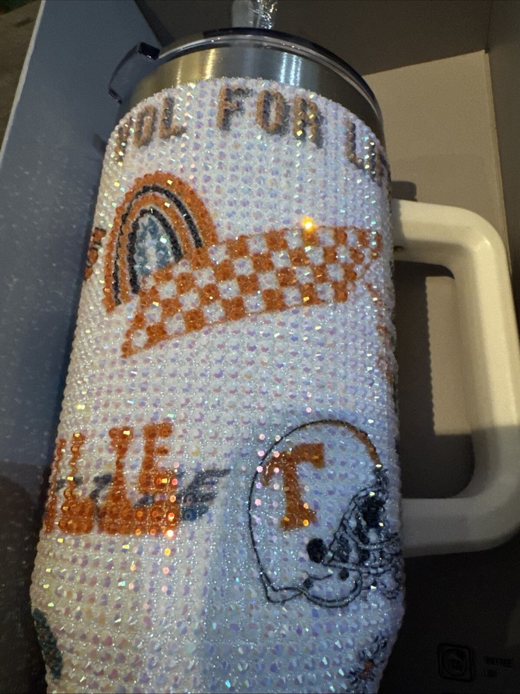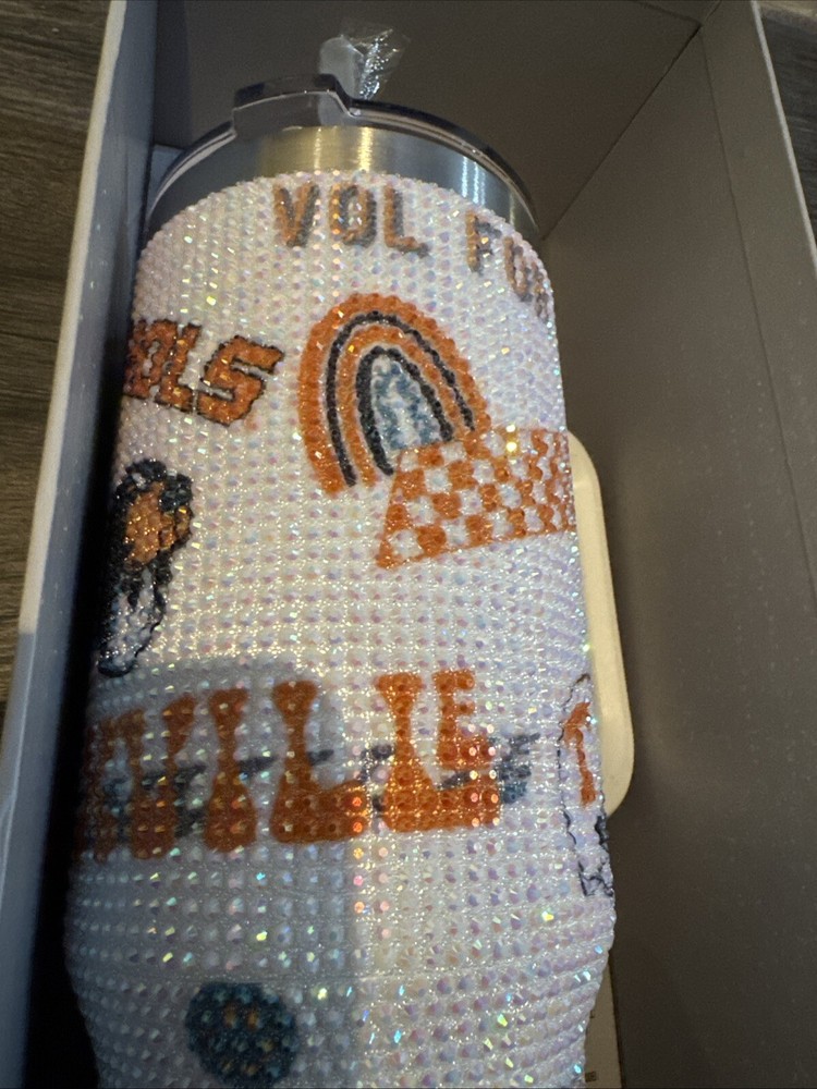 This Tennessee Volunteer Bling Colossal 46oz LIMITED EDITION Steel Rhinestone Tumbler is a multicolor tumbler featuring rhinestones and a bling design, ideal for both hot and cold beverages. It is made of stainless steel and BPA-free plastic, with a drink through lid and a capacity of 46oz. The tumbler is part of the Stanley baseball-themed collection, perfect for teens, boys, girls, kids, and adults, with a handle, lid, and straw included for convenience.