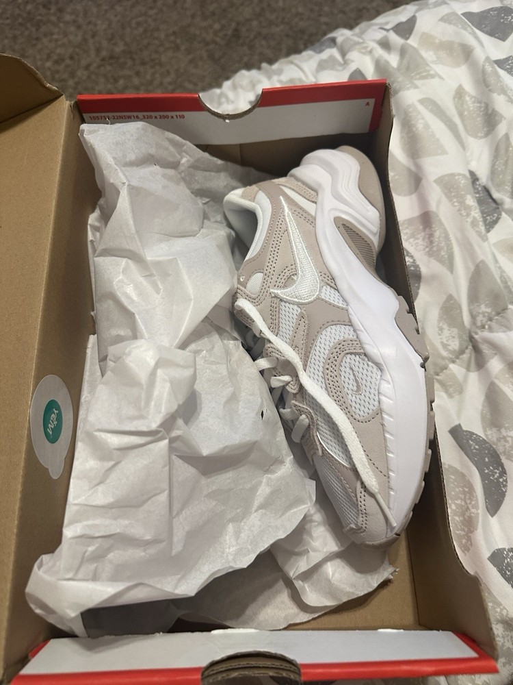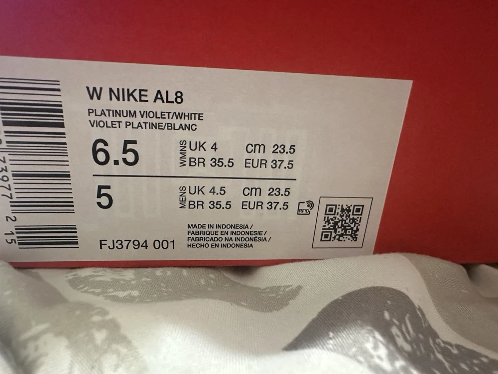 The product is a pair of Nike Al8 tennis shoes specifically designed for women in size US 6.5. The style code is FJ3794-001 and the shoes feature a platinum violet, metallic silver, and white color scheme. Made with a breathable mesh upper material, these athletic sneakers are part of the Nike Al8 product line and were released in 2024. The design incorporates the signature Nike style and is perfect for tennis players looking for comfortable and stylish footwear.