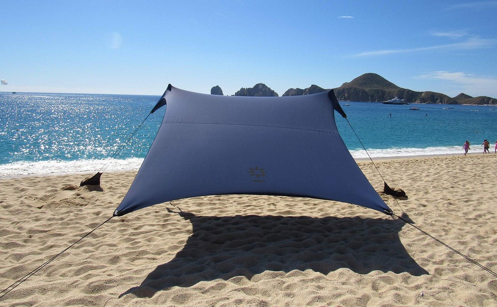 DESIGN. Beautifully Designed in Southern California; Corner anchor bags to be weighed down with sand or rocks MATERIALS. 9x9 high quality Nylon/Lycra blend main tent fabric; Patented Reinforced Corners for long lasting; Rust-proof Aluminum Poles; 7 feet tall! LIGHT & PORTABLE. Easy to Carry. Weighs Only 6.5 pounds! 19.5 inch shoulder carrying bag that Fits in a Carry-on Suitcase. Includes a Cooler Pocket for your drinks and snacks! UPF 50+ PROTECTION, WATER REPELLENT. The Tent will keep you protected on both sunny and rainy days