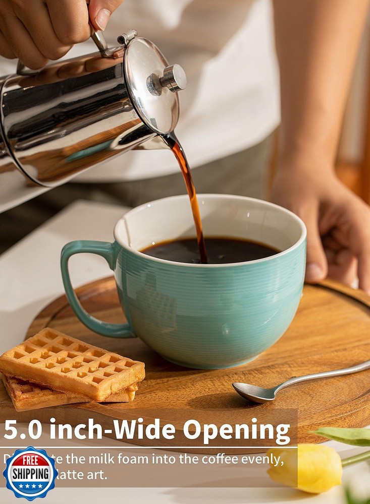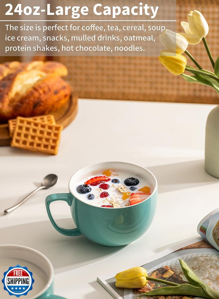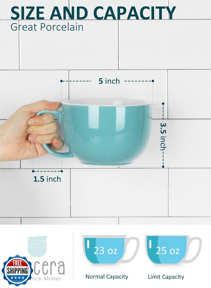 Teocera 24 oz Soup Bowls with Handles, Porcelain Large Coffee Mug Set, Jumbo Mugs, Soup Bowls Mugs set of 4 for Coffee, Oatmeal, Stew - Striped Design, Turquoise Features Large Handle for Big Hands - The handles are big enough for 3 or 4 fingers which is important when they're full. And the wide handle with a flat top will be easier to grip than the typical rounded version. And the handles don't get hot when microwaved, which is an added plus. Striped Design - The large mugs were designed with barely visible striping on the outside for more style. That is more practical yet classic than pure color mugs. Do not hesitate to add this teocera coffee mug set of 4 to your kitchen collection! XXL Capacity - 24oz soup mugs are for people who prefer big drinks. Anything goes in it, deep and large mugs for teas, gumbo, chili or stew. And the 3.5 inches height makes them hard to tip over and will let you feel more secure. Decent Weight, Long-lasting Porcelain - These large mugs with handle are great for office use and home use, as they work well in both cold and hot temperatures. The sturdy porcelain is oven, microwave, freezer and dishwasher safe. 30-DAY Promise❤ - Teocera team has been committed to providing quality products and outstanding service support. We offer a replacement or a 100% refund if you have any questions or concerns about Teocera coffee mugs. Shipping Free & Fast Shipping: We offer free shipping to most of the USA with a normal delivery time of 3-7 days. However, due to the current situation, additional delivery time (up to 3 weeks) may be required for some items. Alternative Carriers: We may use alternative carriers (e.g., USPS, FedEx, UPS) to ensure your package arrives safely and on time. Due to the use of multiple carriers, we are unable to provide a tracking number automatically. Handling Time: Orders are processed and shipped within 1-2 business days of receiving cleared payment. Shipping Restrictions: Shipping to Alaska, Hawaii, Puerto Rico, Guam, and other US territories may incur shipping charges or delivery restrictions. Please contact us before ordering, or your order can be refunded/cancelled. State Restrictions: Certain items may not be shipped to California due to state regulations. Contact for Tracking Updates: If you require tracking updates or have any concerns about the delivery of your order, please feel free to contact us, and we will be happy to assist you. Return Policy 30-Day Hassle-Free Returns: If you are not completely satisfied with your purchase, you can return the item for free within 30 days of receiving it for a full refund or exchange. Easy Return Process: Contact us, and we will provide you with a prepaid return shipping label and detailed instructions. No Restocking Fee: There are no restocking fees for returns. However, the buyer is responsible for return shipping costs if the return is not due to a seller"s error. Refund Processing: Refunds will be processed within 1 business day of receiving the returned item in its original condition. Feedback Your feedback is extremely important to us. We strive to provide the best products and customer service possible. If you are satisfied with your purchase, please take a moment to leave us a positive review. If you have any concerns or issues with your order, please contact us before leaving negative feedback. We are committed to resolving any problems and ensuring your satisfaction. Contact Us If you have any questions or concerns, please feel free to reach out to our customer support team. You can contact us through the eBay messaging system. We are available Monday to Friday, 9:00 am to 5:00 pm EST, and we will do our best to respond to your inquiry within 24 hours. Thank you for supporting our small family business!