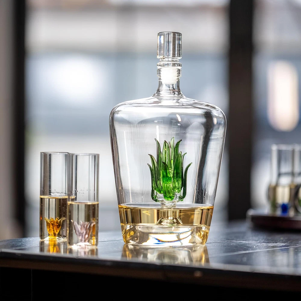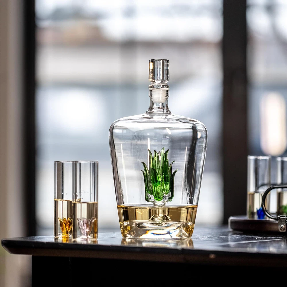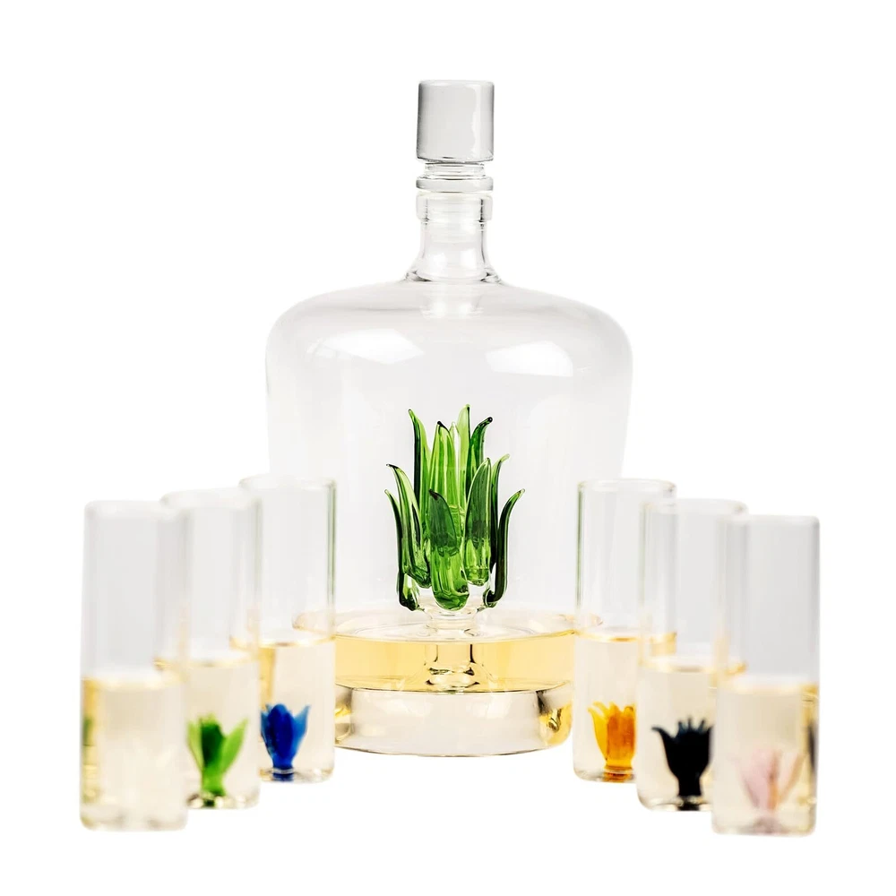 IMPRESS YOUR BAR SET WITH AGAVE STYLE WITH THIS LARGE WHISKEY AGAVE DECANTER: This TEQUILA decanter is Great as a starter of finishing touch for any bar. This is a hand crafted carefully constructed TEQUILA decanter with AGAVE glasses, will make anyone admire the artfully detailed agave shape spirits decanter. SIZE: 750mL Decanter, 3oz shot glasses. ARTISAN CRAFTED - AN ABSOLUTE MUST FOR THE CONNOISSEUR AND SAVANT: Every bar should have this impressive display decanter and glasses.This decanter set with agave glasses is a must have for the adventurer or the true connoisseur BEAUTIFUL AGAVE DECANTER AND SHOT GLASSES: The hand crafted glass agave plant displays the Tequila plant with 6 agave shot glasses are a beautiful match, pair with your favorite Tequila scotch, whiskey, wine or port PERFECT GIFT: Makes for a great gift for any occasion, Birthday, Anniversary, Valentines day, Love, Husband Boyfriend home welcoming gift or just because!
