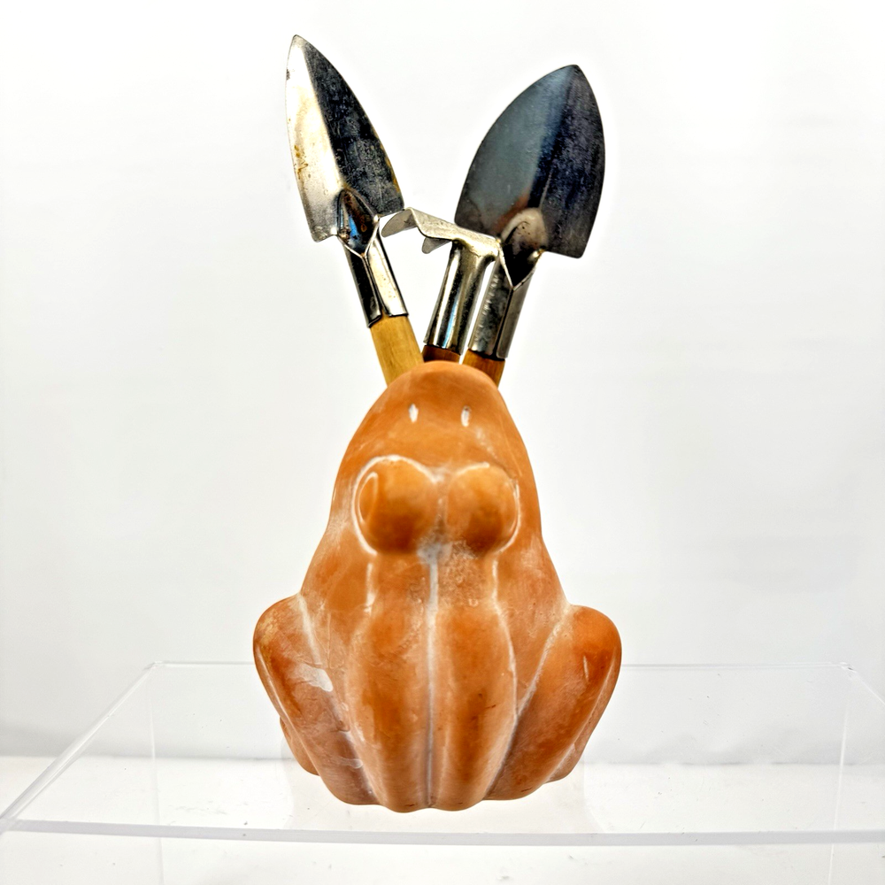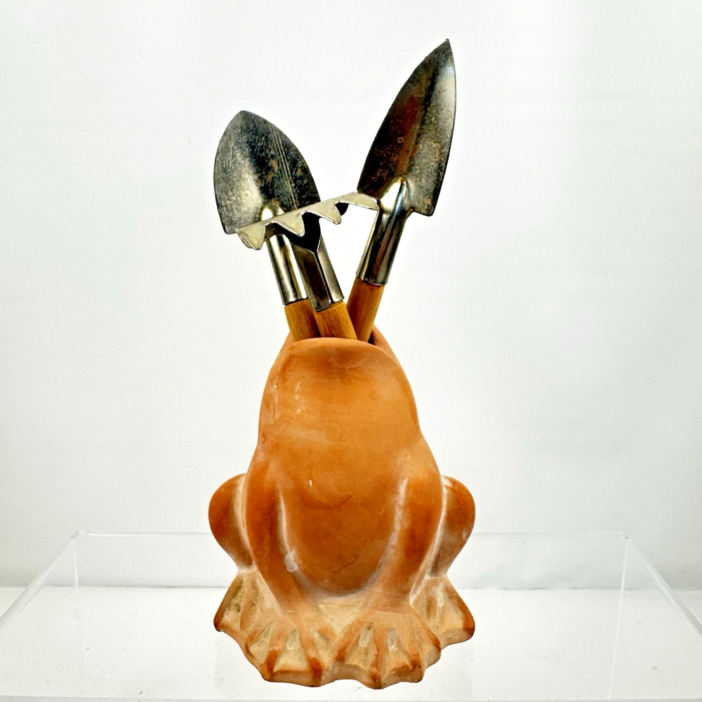 Terracotta Frog Pottery Figurine with 3 Mini Gardening Tools Clay Sculpture Garden Yard Art. Pre-owned item in good condition, has some wear as you'd expect from a used item. Cute indoor or outdoor decor. S light imperfections due to use and age. Please use the zoom feature to determine shape and condition, check all pictures and measurements carefully for detailed viewing as they are part of the description and help you with your purchase. I invite you to always check my new listings, buy with confidence. Smoke free home. Thank you, have a wonderful day!! HD - 126